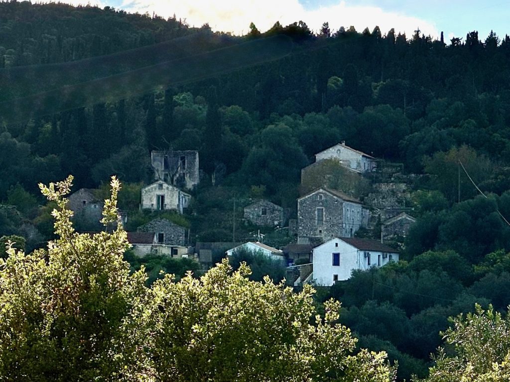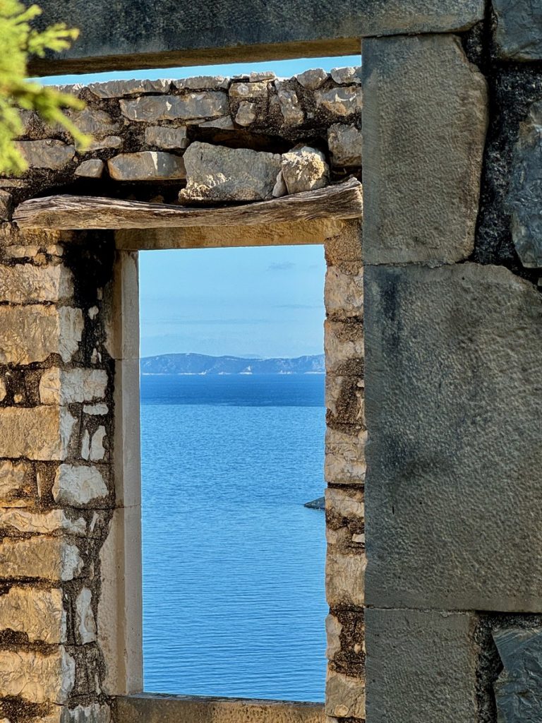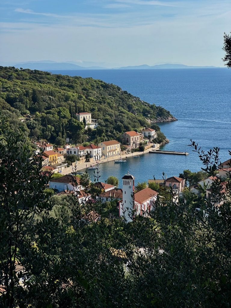 Der Weg führt weiter bergan, vorbei an einer kleinen Kapelle und verschiedenen Ruinen des ehemaligen Insel-Hauptortes „Paleochora“, der vom Mittelalter bis zur venezianischen Zeit seine Blütezeit hatte. In den unsicheren Zeiten des Mittelalters wohnte man weit weg vom Meer in Häusern mit dicken Mauern und kleinen Fenstern, die sich gut verteidigen ließen. Mit den Venezianern wurden die Zeiten sicherer, und die Einwohner zogen nach Perachori und Vathy und gaben ihre alten Häuser auf. Verstreut auf den Hängen und überwuchert von Buschwerk finden sich weitere Ruinen abseits des Weges, wir sehen nur die der alten Kirche. Wenig später erreichen wir das Bergdorf Perachori, in dem es angeblich ein Café mit einem hervorragenden Ausblick geben soll. Schon unterwegs halten wir mehrfach an, um den wunderbaren Ausblick auf Bucht, Meer und Inselwelt in uns aufzunehmen – so schön!