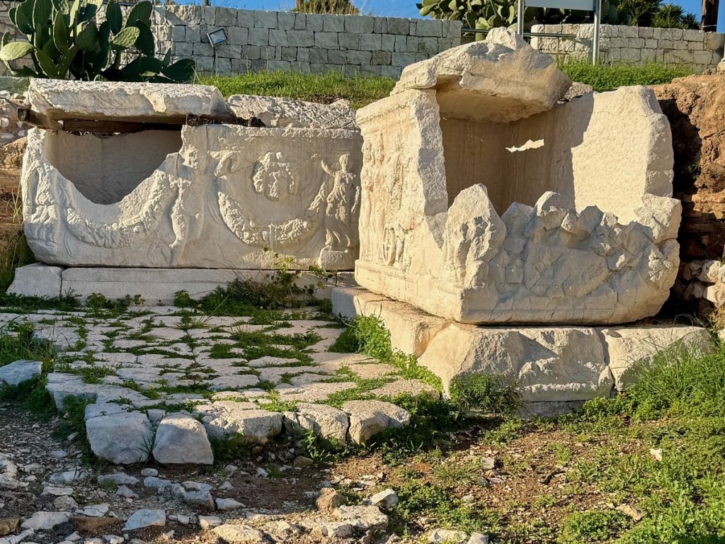 In Fiskardo ankert bereits ein Katamaran im Hafenbecken – wir tun es ihm gleich. Auch an der Pier gibt es zwar noch „römisch-katholische“ Liegeplätze, aber wir wollen unsere Ruhe im Cockpit und in der Koje. Der Anker hält allerdings erst beim dritten Versuch. Eigentlich ist hier Sand, aber wegen der angesagten Windrichtung müssen wir ihn im rechten Winkel ablandig einfahren und ziehen ihn dabei offensichtlich immer wieder aus dem Sand. Letztlich liegt er auf 5m Tiefe und wir geben 20m Kette und setzen das Reitgewicht, um unseren Schwoikreis zu verkleinern. Nachdem der Ankeralarm gesetzt ist, paddeln wir an Land zu einem kleinen Rundgang durch den hübschen kleinen Hafenort. Leider ist alles geschlossen. Gern würden wir diese Orte auch weniger ausgestorben erleben. Vielleicht kommen wir im Frühjahr nochmals zurück, wenn die Saison startet. So sehen wir uns die römischen Gräber vor Ort an und die Skipperin hängt noch die „Lighthouse-Wanderung“ dran.