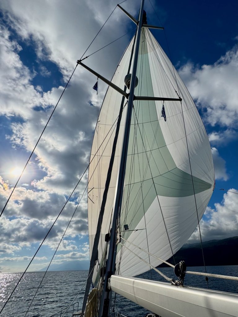 Nach einer erholsamen Nacht und dem Morgenkaffee samt Tageszeitung starten wir in die weitere Tagesplanung. Wir wollen weiter Richtung Süden. Zum einen, um noch mehr von der Insel kennenzulernen, zum anderen, um unsere Vorräte aufzustocken. So langsam neigen sich auch die Dauervorräte dem Ende entgegen. Nudeln mit Pesto oder Tomatensoße könnten wir zwar noch ein paar Tage essen, aber das wär es auch schon. Wir haben gegoogelt und gehen davon aus, dass der Ort Sami groß genug sein müsste, um mit geöffneten Tavernen und Läden auch im Winter dienen zu können. Nachdem wir den Anker gelichtet haben, laufen wir eine halbe Meile aus der Bucht, bis wir aus dem größten Windschatten heraus sind und etwas Wind wahrnehmen. Wir rollen erstmal nur die Genua aus und laufen mit langsamen 3 Knoten in Richtung Süden. Es steht kaum Welle und wir haben Lust endlich mal unseren Blister auszuprobieren. Bisher war er nur zum Lüften und Trocknen im Hafen oben. Wir befestigen das „Tack-Auge“ am Ankerbeschlag, suchen uns eine viel zu lange (und eigentlich auch zu dicke) Schot aus der Leinen-Backskiste und knoten sie an das Clew-Auge. Nun erstmal die Genua einrollen, damit sich der Spifall nicht mit ihr verdreht (das Problem haben wir auf Jento immer). Dann zieht Werner den Blister im Bergeschlauch hoch und liftet mit den Leinen daran den Schlauch nach oben. Der Blister bläht sich sofort und hat einen imensen Druck, den Barbara nicht aus der Hand halten kann. Anfängerfehler, natürlich muss die Schot um die Winsch geführt werden – aus Schaden wird man (hoffentlich) klug. Venga! nimmt Fahrt auf und steigert sich schnell auf 4-5 Knoten, in den stärkeren Böen auch auf 6 Knoten Fahrt. Leider kommt der Wind zu platt von achtern, daher luven wir etwas an und laufen nun auf Ithaka zu. Nach gut einer Stunde schifften wir den Blister auf die andere Seite. Da wir nur eine Schot angeschlagen haben, müssen wir ihn dazu mittels Bergeschlauch bergen, die Schot auf die andere Seite legen und den Bergeschlauch dann wieder nach oben ziehen. Etwas umständlich, aber es übt im Handling. Werner ist begeistert, wie sehr der Bergeschlauch das bergen des 125 Quadratmeter großen Segels erleichtert und will sofort einen Bergeschlauch für Jento, auf der wir ja schon manchen Kampf mit dem nur 75 Quadratmeter-Segel hatten.