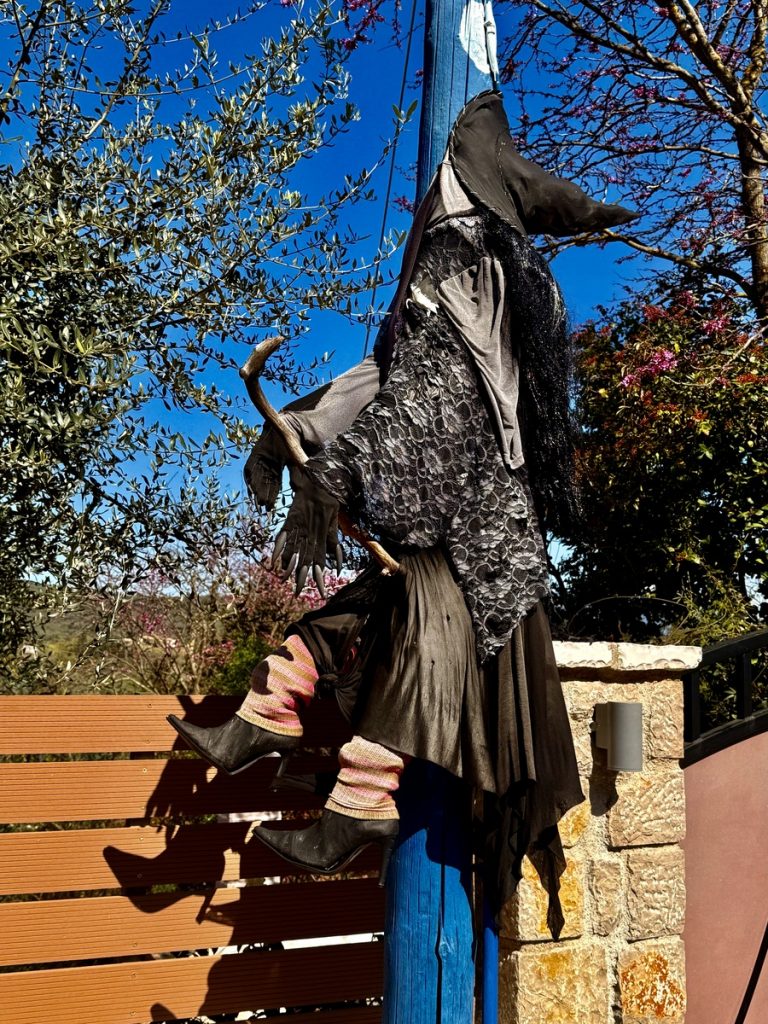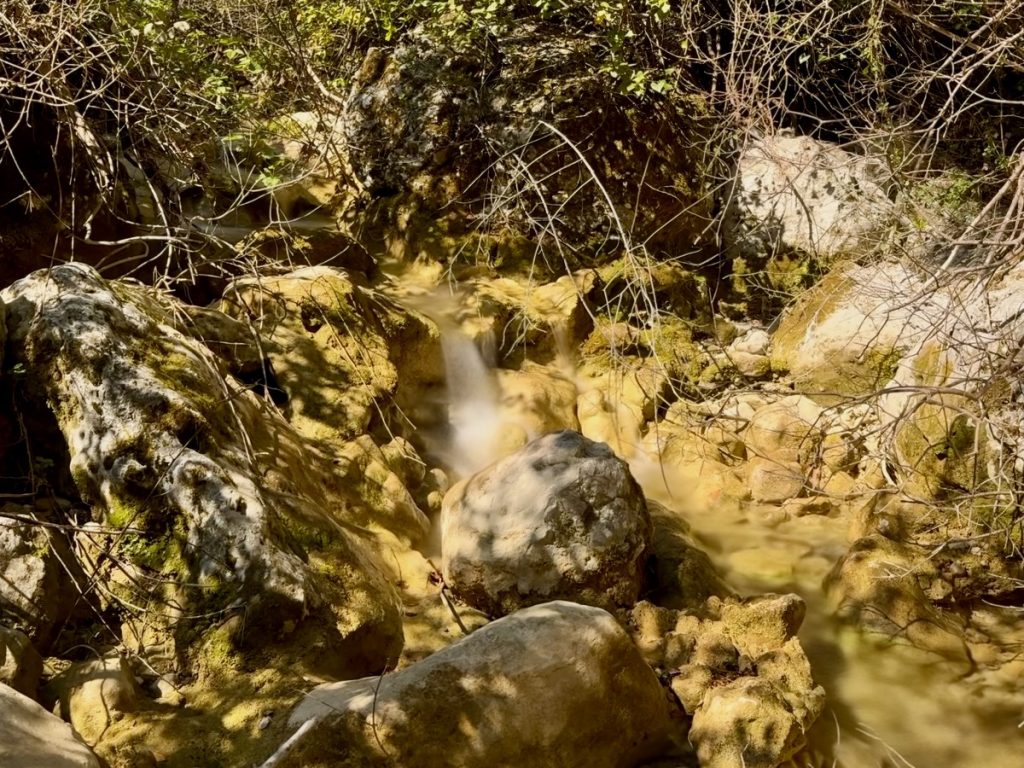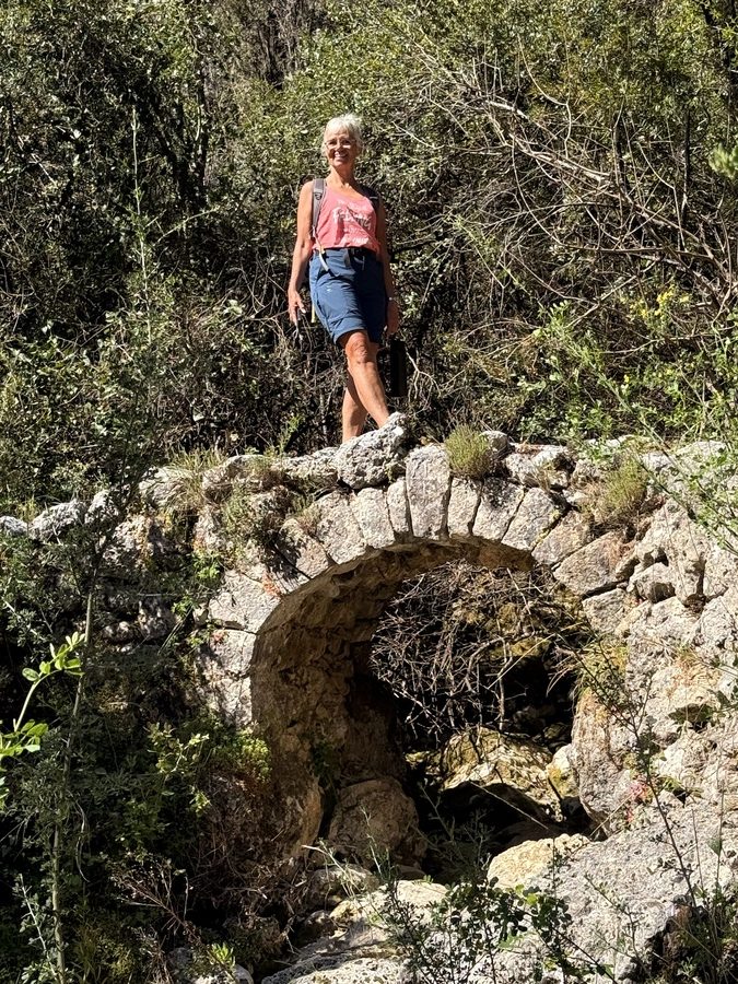 Elf Stunden Sonne erwarten uns heute und die wollen wir wieder für Bewegung im Freien nutzen. Bis zur Melissa-Schlucht ist es zu Fuß leider zu weit, aber wir haben uns eine 13 Kilometerrunde bei Komoot zusammengestellt. Den Morgenkaffee nehmen wieder im sonnigen Cockpit ein, bevor wir mit dem Dinghi an Land fahren. In den Cafés sitzen die Griechen bei Kaffee, Wasser und Plausch. Unser Weg führt über Nebenstraßen durch Olivenhaine und vorbei an plätschernden Bächen langsam bergan. Es ist das Kontrastprogramm zur letzten Wanderung. Die Bergwelt ist hier weniger steil, weniger hoch und weniger spektakulär. Wir haben nur hin- und wieder einen Ausblick zu Bergdörfern oder zum Meer. Den Augen und dem Kopf tut es gut, mal weniger gefordert zu werden. Nur an einer kleinen alten Brücke über einen Bach und an den Ruinen einer Wassermühle kommen wir vorbei.