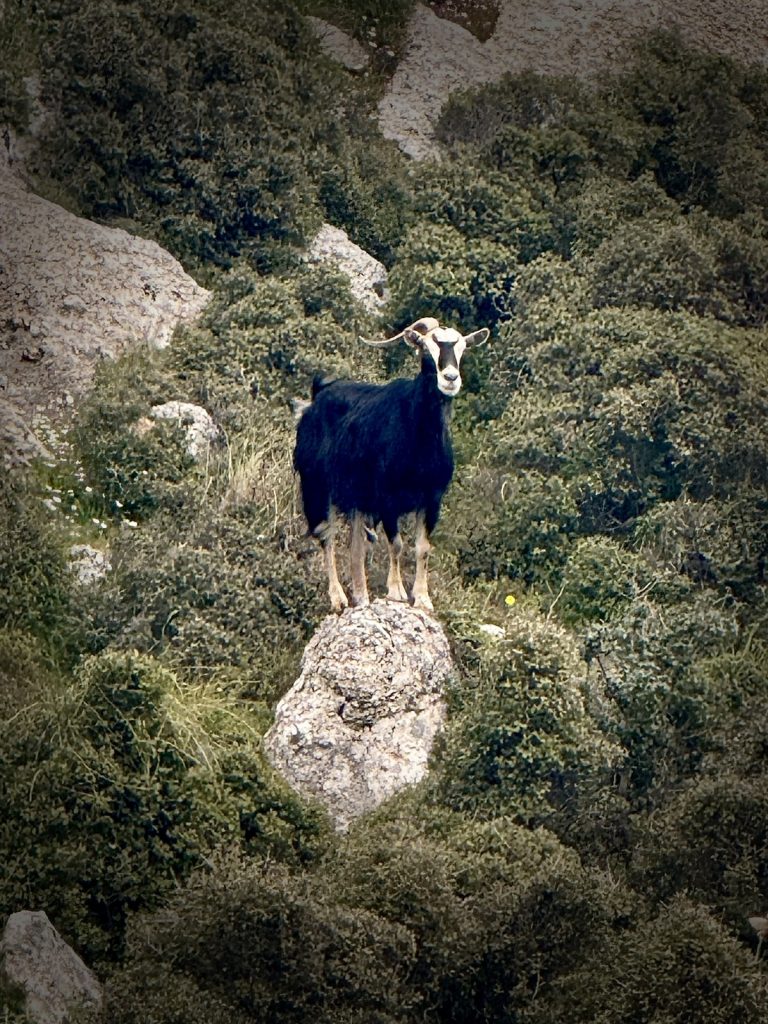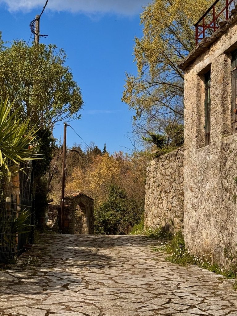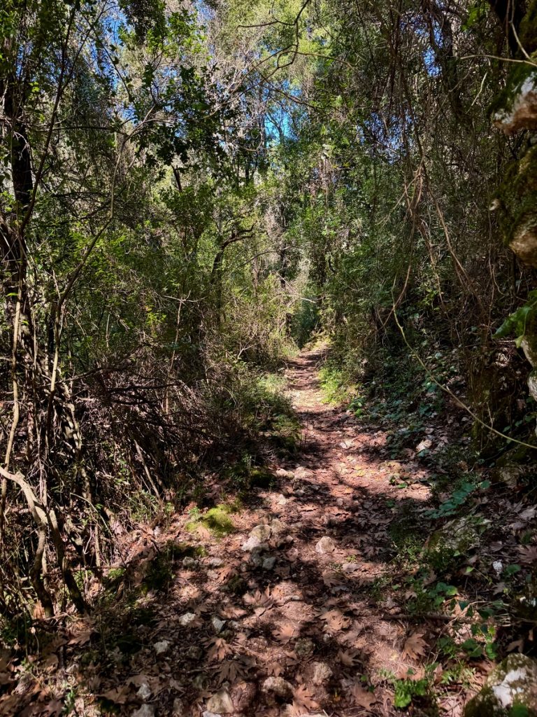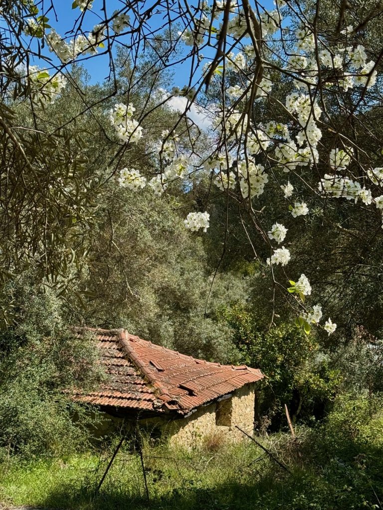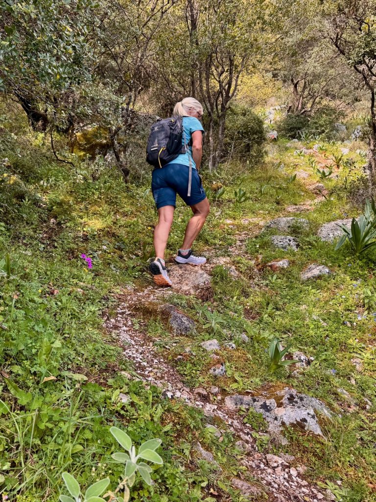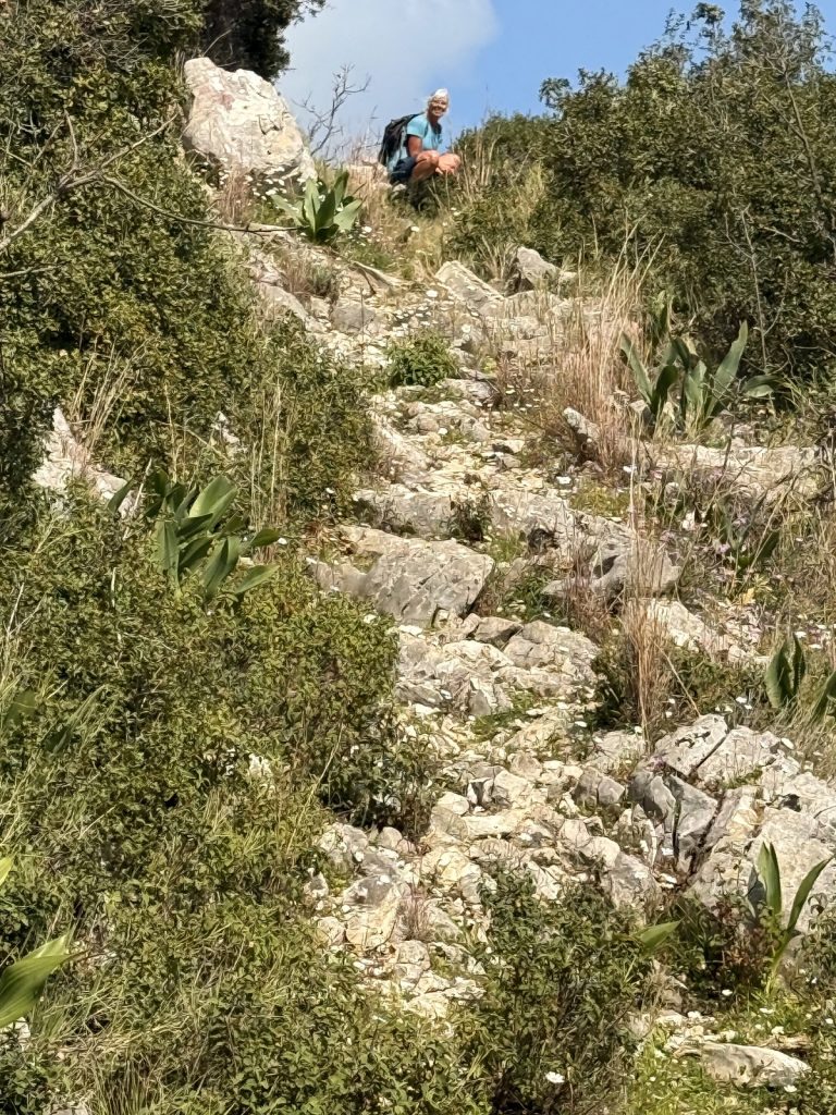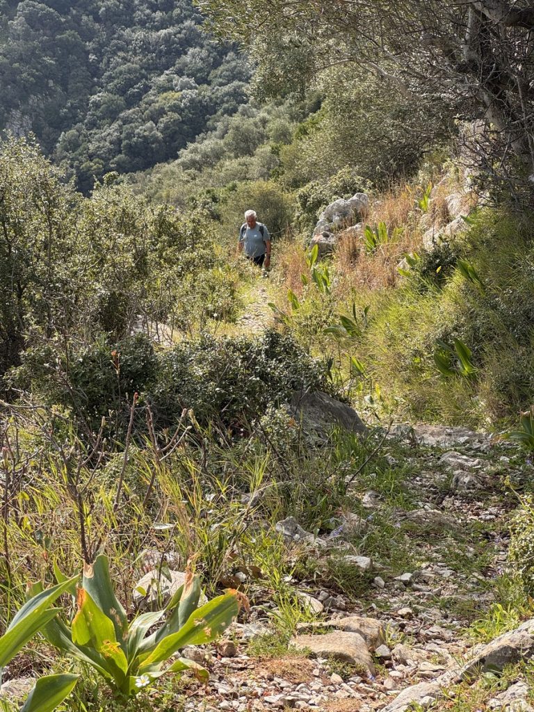 Danach geht es mit frischen Kräften weiter durch den „Trockenwald von Skaros“, vorbei an einem Wellblechlager, in dem ein alter Mann hier auf dem Berg mit seinem Hund haust, bis zu einem Wirtschaftsweg. Diesen verlassen wir nach kurzer Zeit. Um wiederum auf markiertem Pfad über einen alten Eselsweg bis zur Klosterruine des Heiligen Georgs und weiter zum Bergdorf Kolyvata zu gelangen. Wir lieben diese alten schmalen Bergwege, auch wenn sie nach dem Winter teilweise einem Bachlauf gleichen und man sehr aufpassen muss, wohin man die Füße setzt. Das kleine Bergdorf präsentiert sich recht verlassen und die bei Komoot markierte Einkehrmöglichkeit „Marias Taverne“ ist leider noch geschlossen.