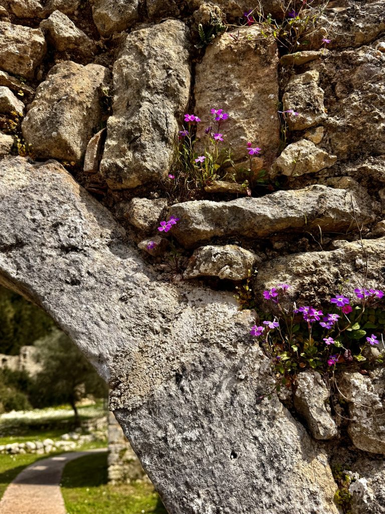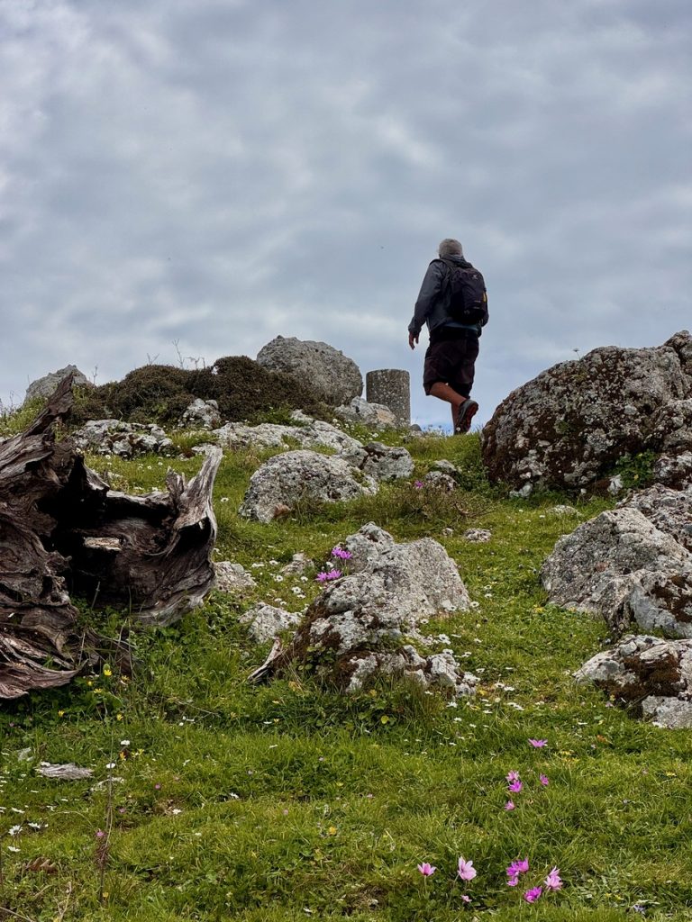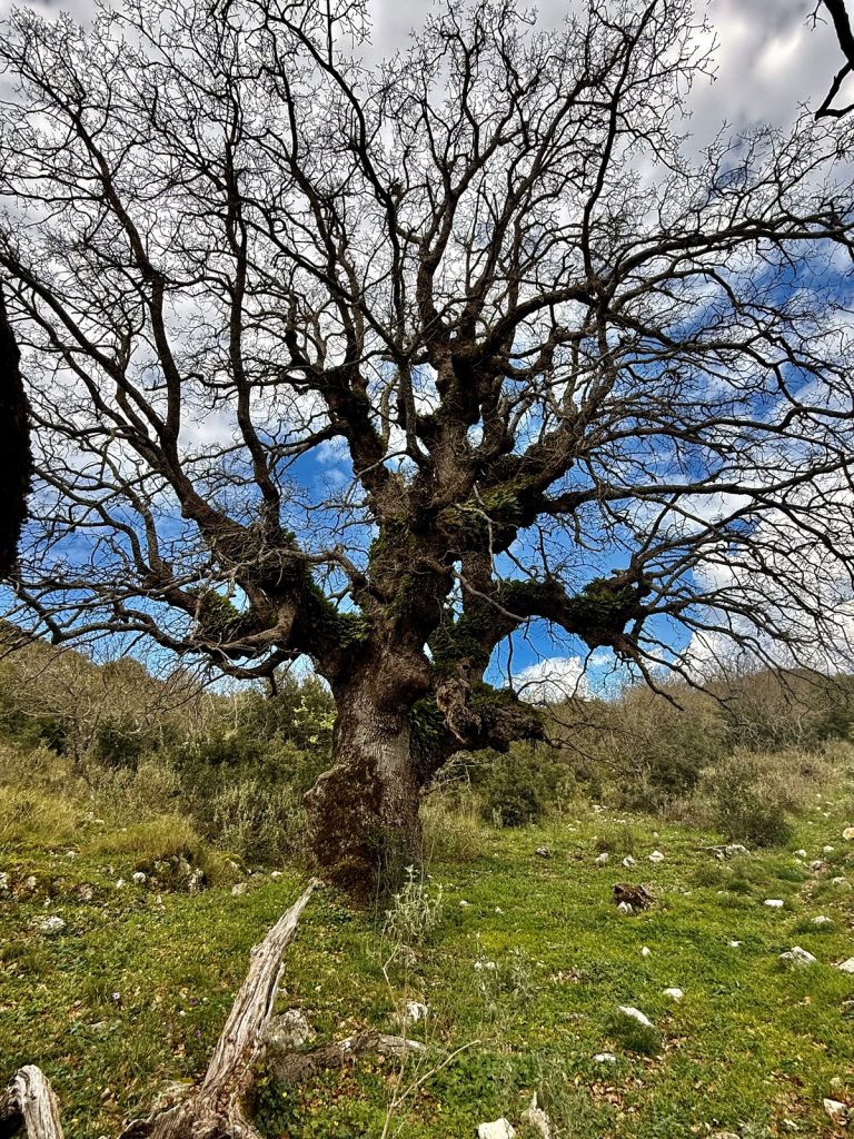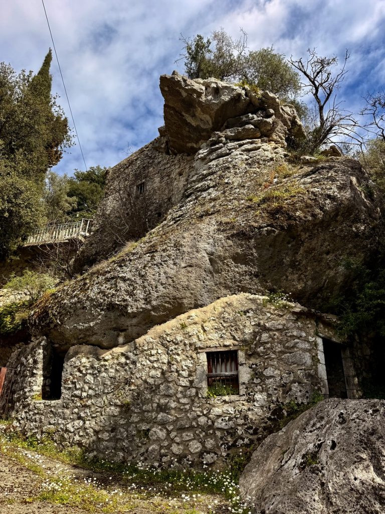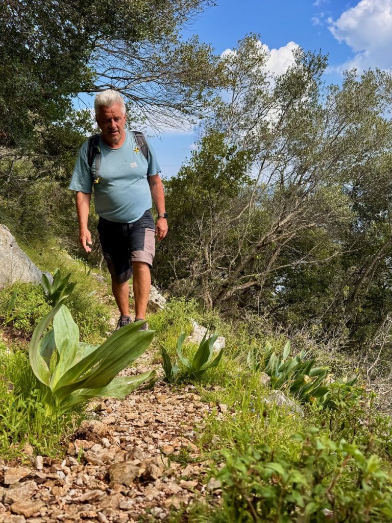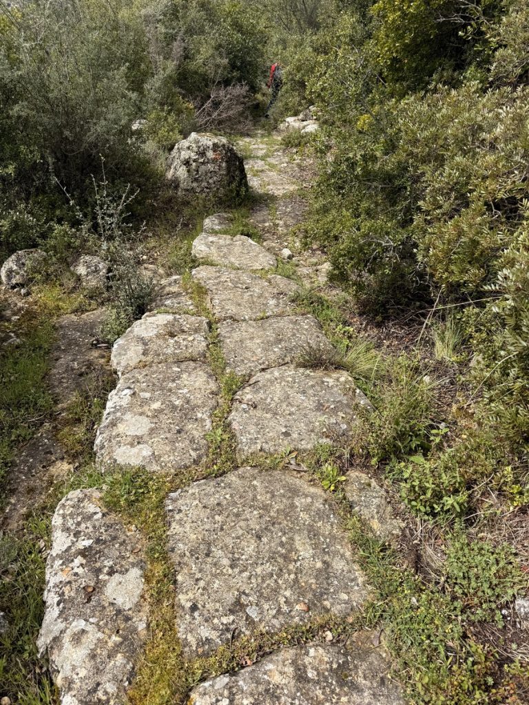 Danach geht es mit frischen Kräften weiter durch den „Trockenwald von Skaros“, vorbei an einem Wellblechlager, in dem ein alter Mann hier auf dem Berg mit seinem Hund haust, bis zu einem Wirtschaftsweg. Diesen verlassen wir nach kurzer Zeit. Um wiederum auf markiertem Pfad über einen alten Eselsweg bis zur Klosterruine des Heiligen Georgs und weiter zum Bergdorf Kolyvata zu gelangen. Wir lieben diese alten schmalen Bergwege, auch wenn sie nach dem Winter teilweise einem Bachlauf gleichen und man sehr aufpassen muss, wohin man die Füße setzt. Das kleine Bergdorf präsentiert sich recht verlassen und die bei Komoot markierte Einkehrmöglichkeit „Marias Taverne“ ist leider noch geschlossen.