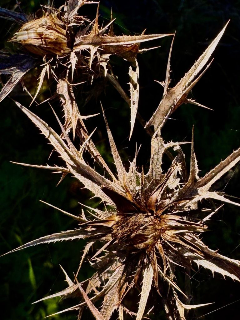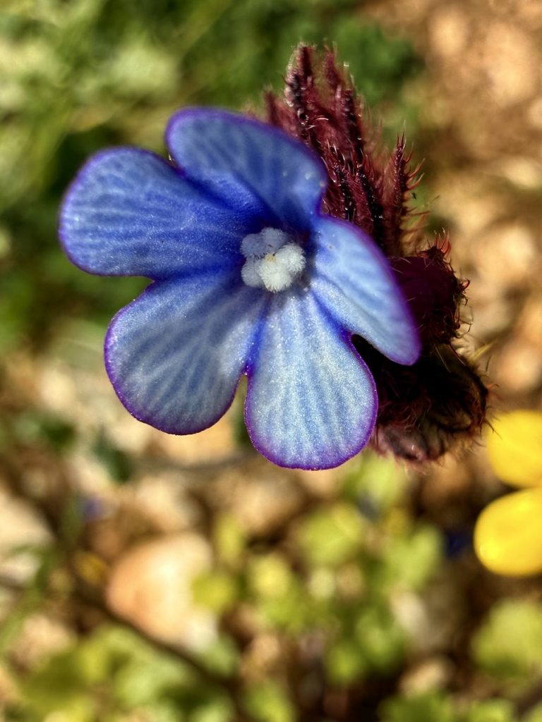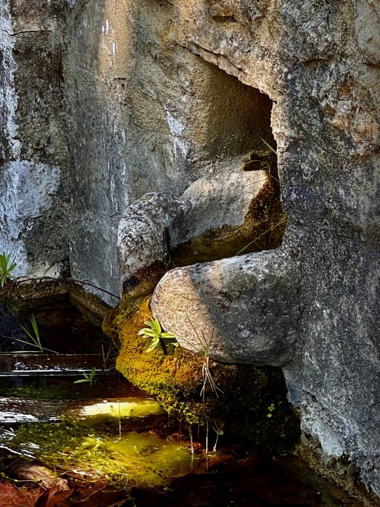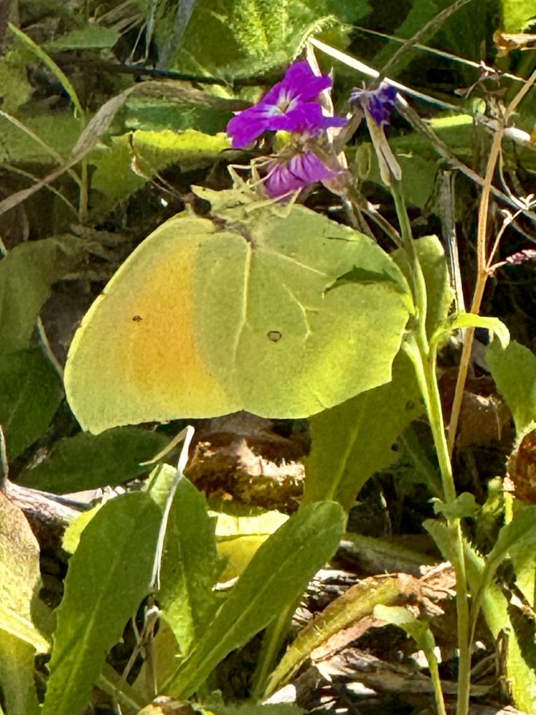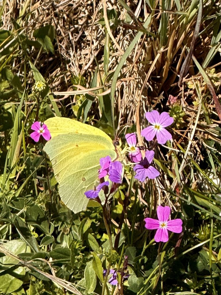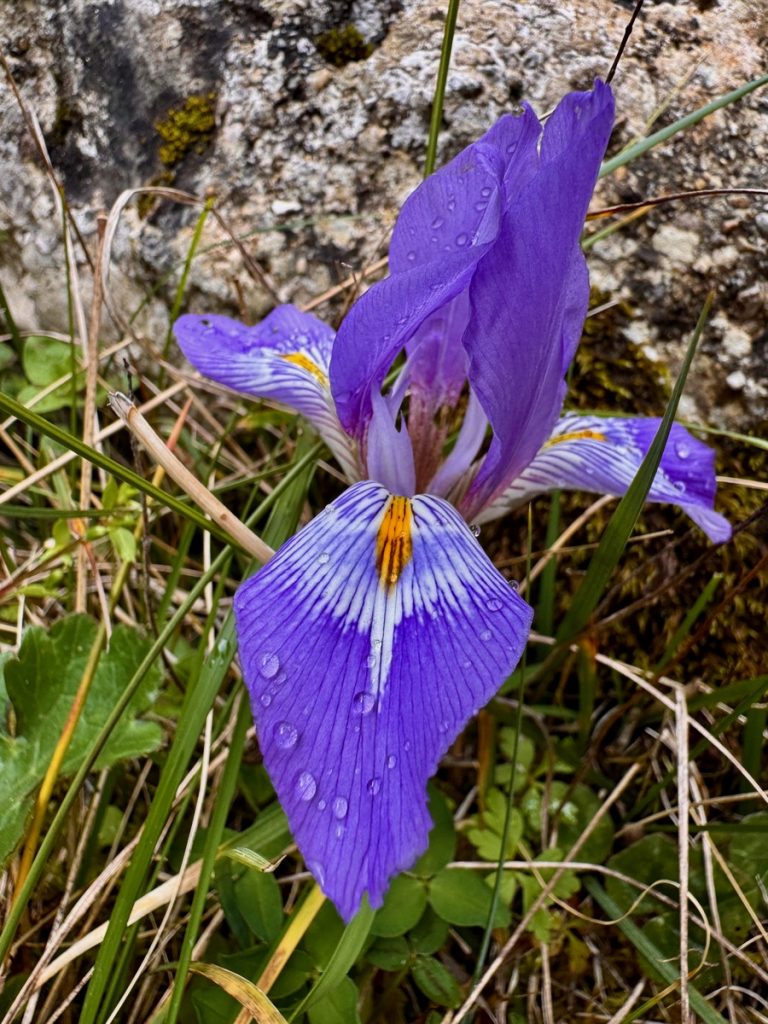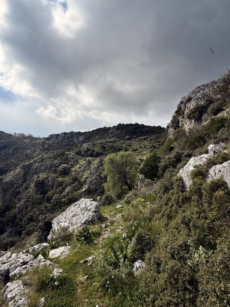Danach geht es mit frischen Kräften weiter durch den „Trockenwald von Skaros“, vorbei an einem Wellblechlager, in dem ein alter Mann hier auf dem Berg mit seinem Hund haust, bis zu einem Wirtschaftsweg. Diesen verlassen wir nach kurzer Zeit. Um wiederum auf markiertem Pfad über einen alten Eselsweg bis zur Klosterruine des Heiligen Georgs und weiter zum Bergdorf Kolyvata zu gelangen. Wir lieben diese alten schmalen Bergwege, auch wenn sie nach dem Winter teilweise einem Bachlauf gleichen und man sehr aufpassen muss, wohin man die Füße setzt. Das kleine Bergdorf präsentiert sich recht verlassen und die bei Komoot markierte Einkehrmöglichkeit „Marias Taverne“ ist leider noch geschlossen.