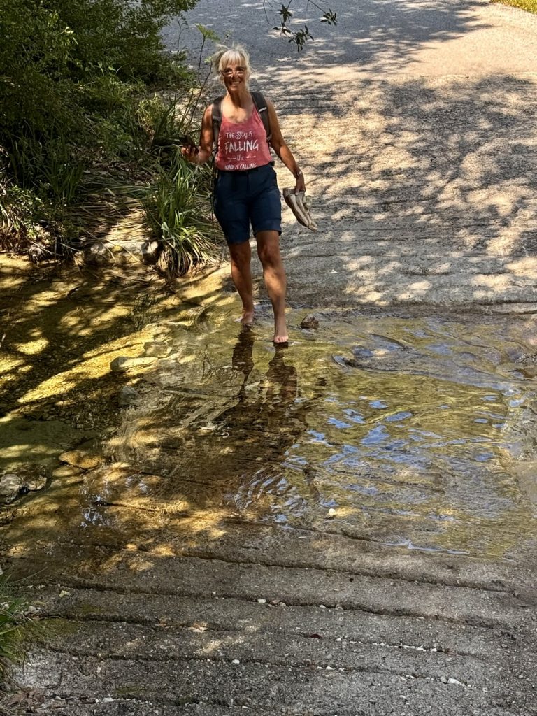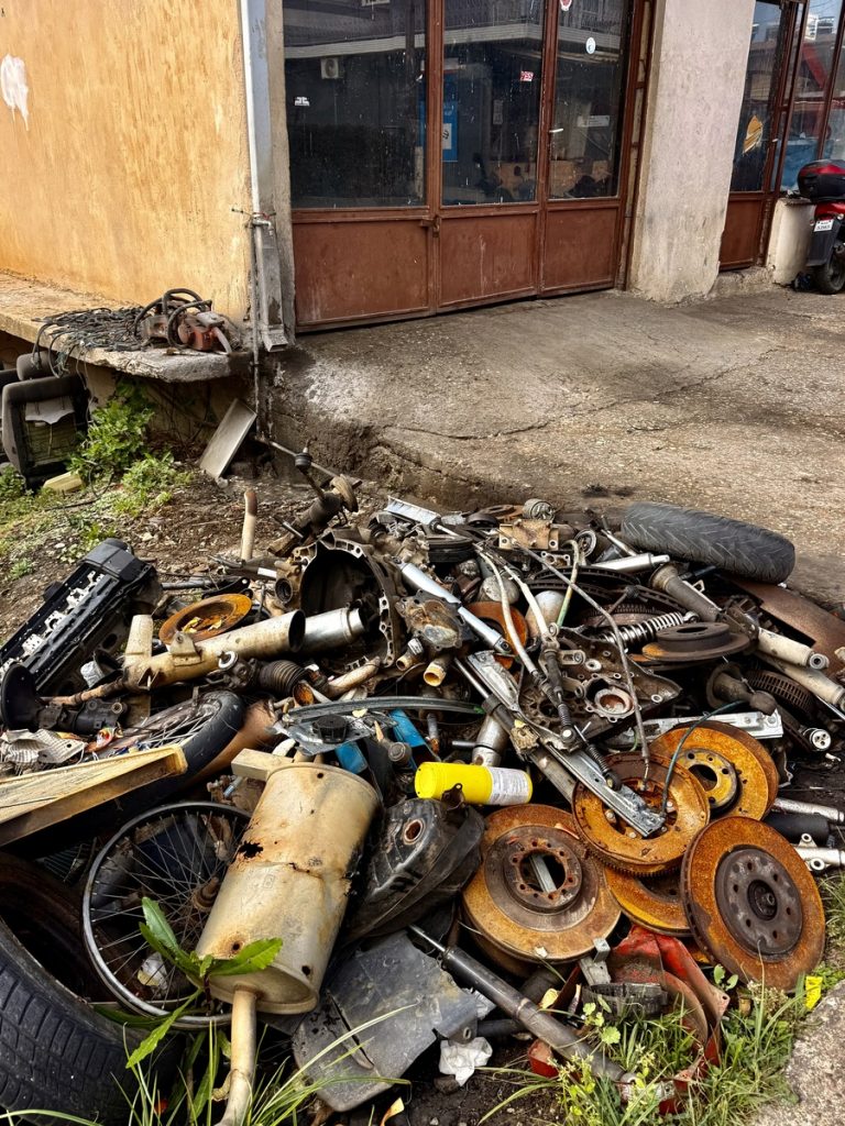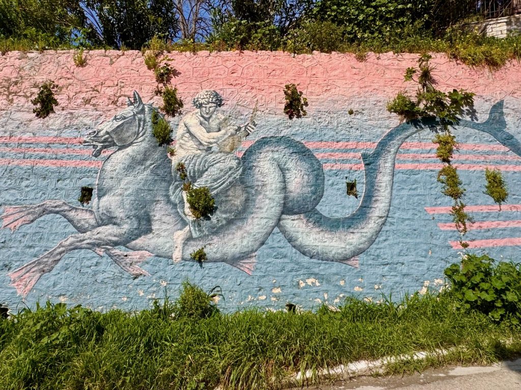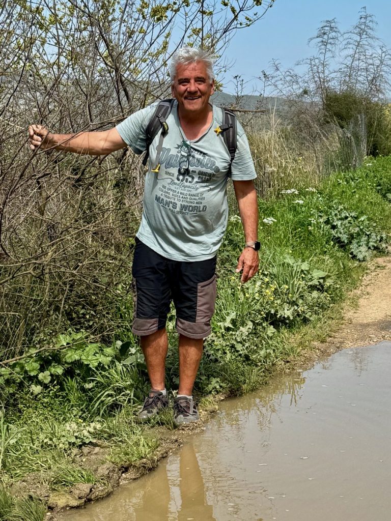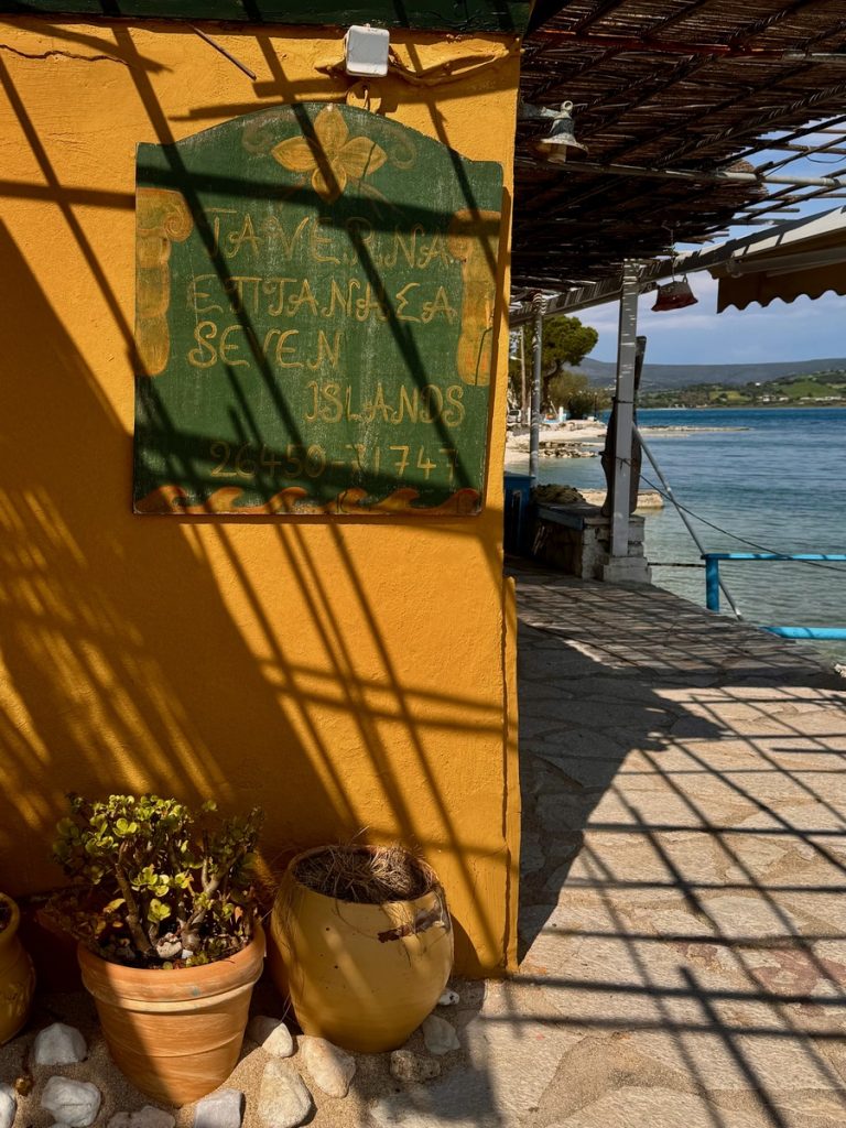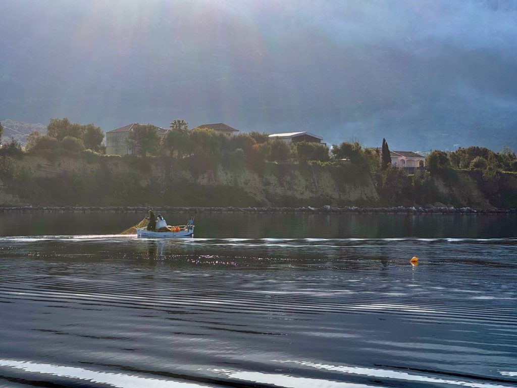Für heute ist mal wieder Bewegung angesagt, eine leichte 10-Kilometerrunde mit wenig Steigung. Wir parken das Dinghi wieder am Strand und vertäuen es zur Sicherheit an einem Baum. Die Skipperin fällt gleich auf die Knie, denn hier gibt es richtig viel und schön abgeschliffenes Meerglas zu finden. Mit gut gefüllter Hosentasche geht es los. Am Ende der Bucht schließt sich ein flache und von Gräben durchzogenes Flachland Richtung Norden. Wir stoßen auf einige Tierkadaverreste, nicht so schön. Es sieht nach Schaf oder Ziege aus. Wir fragen uns, ob das etwas mit der Schaf- und Ziegenseuche zu tun haben kann, von der wir im Herbst lasen, sie sei der Grund für den gestiegenen Preis für Schaf- und Ziegenkäse. In einem weiten Bogen geht es Richtung Berge und an der Flanke etwas bergan. Unterwegs kommen wir immer wieder an wilden Müllkippen vorbei – auch nicht schön. Der Weg ist teilweise von Traktoren ziemlich kaputtgefahren und matschig. Bei einer besonders großen Pfütze kann der Skipper-Ingenieur es nicht lassen und kümmert sich um eine Wasserableitung – die Schuhe sehen im Anschluss entsprechend aus. Wir hatten sehr darauf gehofft, irgendwo einen schönen Platz für unser Picknick zu finden, aber das ist leider Fehlanzeige. Rechts und links des Weges befinden sich meist hohe Zäune und an eine Bank mit Ausblick hat keiner gedacht. Erst als wir wieder zum Ort Palairos hinunterkommen, finden wir eine Bank auf einem Spielplatz. Wir haben uns nun zwar bewegt, aber mehr als 3 (von 5) Sterne verdient diese Runde nicht. Wer es trotzdem versuchen möchte, für den