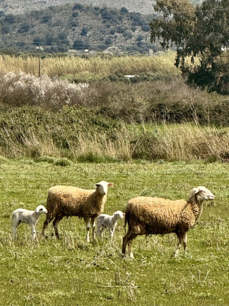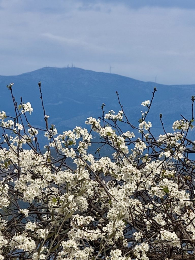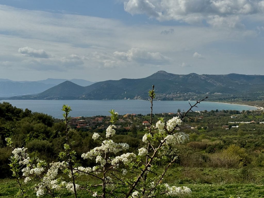 Die Wanderung führt uns auf 310 Höhenmeter hinauf. Dort finden wir einen Platz im Olivenhain für unser Picknick. Danach geht es wieder bergab, vorbei an blühendem Ginster, blühenden Obstbäumen und weiteren plätschernden Bächen, die teilweise auch die Straße überfluten. Nach 14 Kilometern erreichen wir wieder Ligia und sind erstaunt, über die vielen Menschen in den kleinen Tavernen am Hafen. Heute haben deutlich mehr geöffnet. Und erst da fällt es uns wieder ein: die Griechen feiern heute ihren Unabhängigkeitstag! Wir kaufen einige Zutaten für einen griechischen Salat und kehren zurück zur Venga!, wo wir uns im sonnigen Cockpit für ein Mittagsschläfchen ausstrecken.