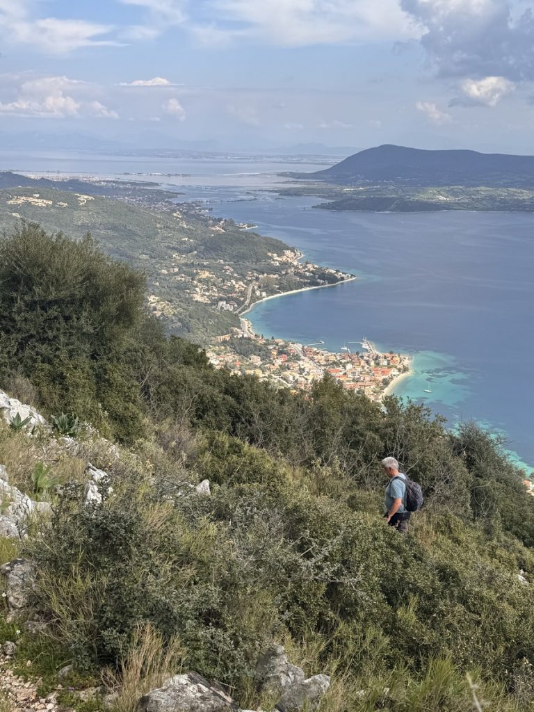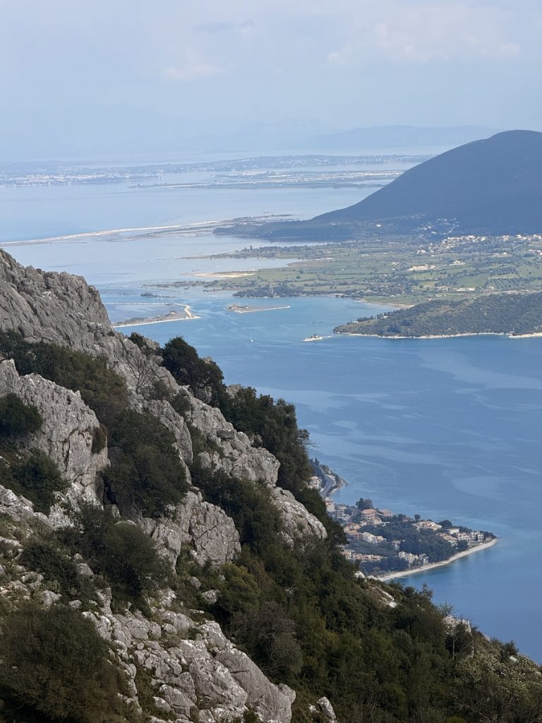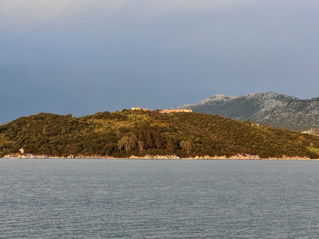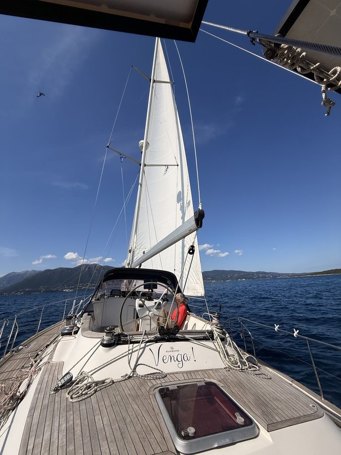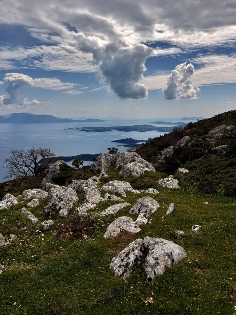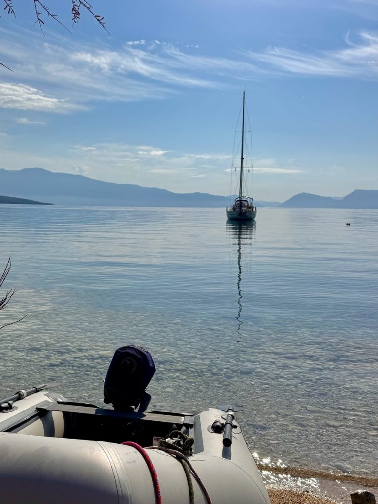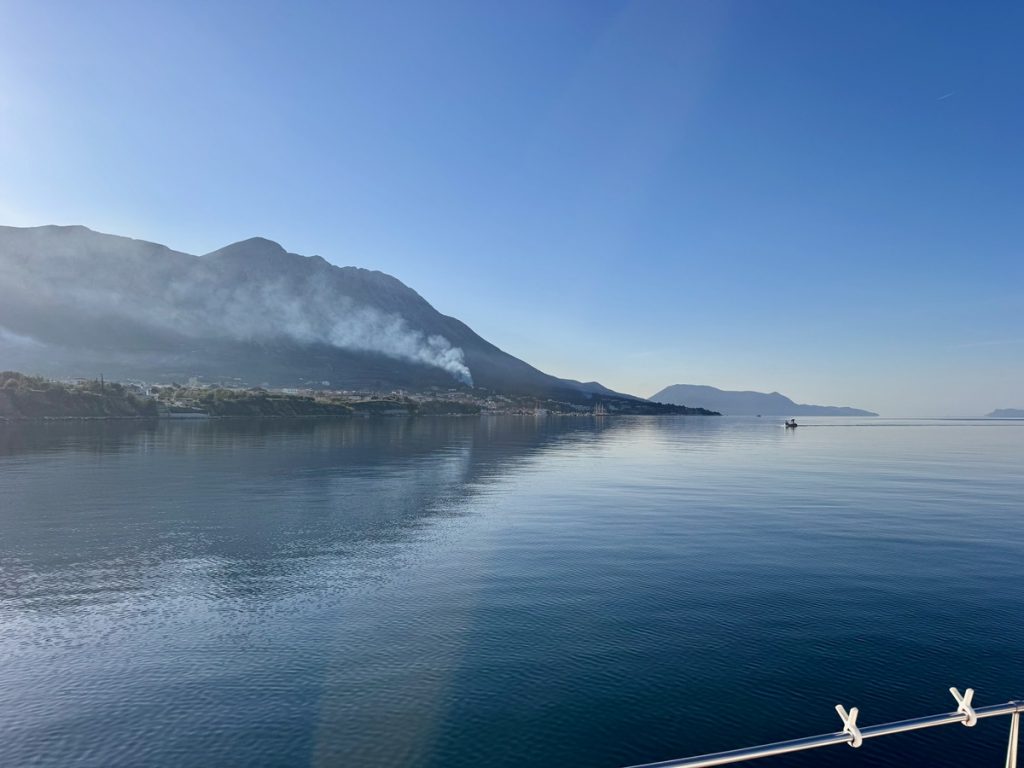 Heute zieht es uns weiter. Anfangs peilen wir Mytikas, einen kleinen Ort etwas südlich an der Festlandsküste an. Aber die Komoot-Recherche lässt dort wenig abwechslungsreiche Wandermöglichkeit erkennen. Auch dort gibt es eine große Tiefebene und bis zu den ersten Anstiegen sind erstmal einige Kilometer zurück zu legen. Also biegen wir im 90° Winkel ab und laufen (unter Maschine, da absolut gebügeltes Wasser) nach Westen in Richtung Lefkada. Etwas nördlich von Nydri gibt es den Berg Skaros, den die Skipperin schon seit letztem März im Auge hat. Dort will sie unbedingt mal rauf. Nach ein paar Meilen kommt plötzlich Südwind auf. Nicht viel, aber segelbar. Also wird die Genua ausgerollt und die letzten 6 Seemeilen ganz entspannt auf Halbwindkurs mit 4 Knoten gesegelt. Bei der Gelegenheit wird nun natürlich auch der Autopilot getestet. Alles funktioniert bestens – unser 3. Crewmitglied ist wieder an Bord!