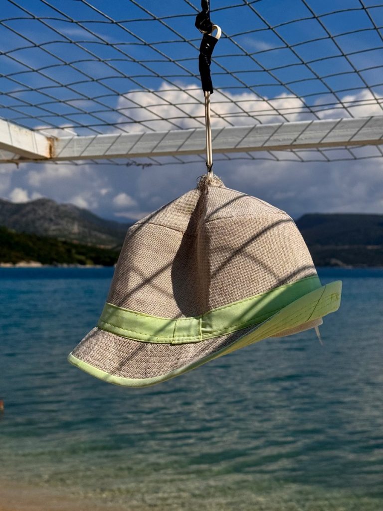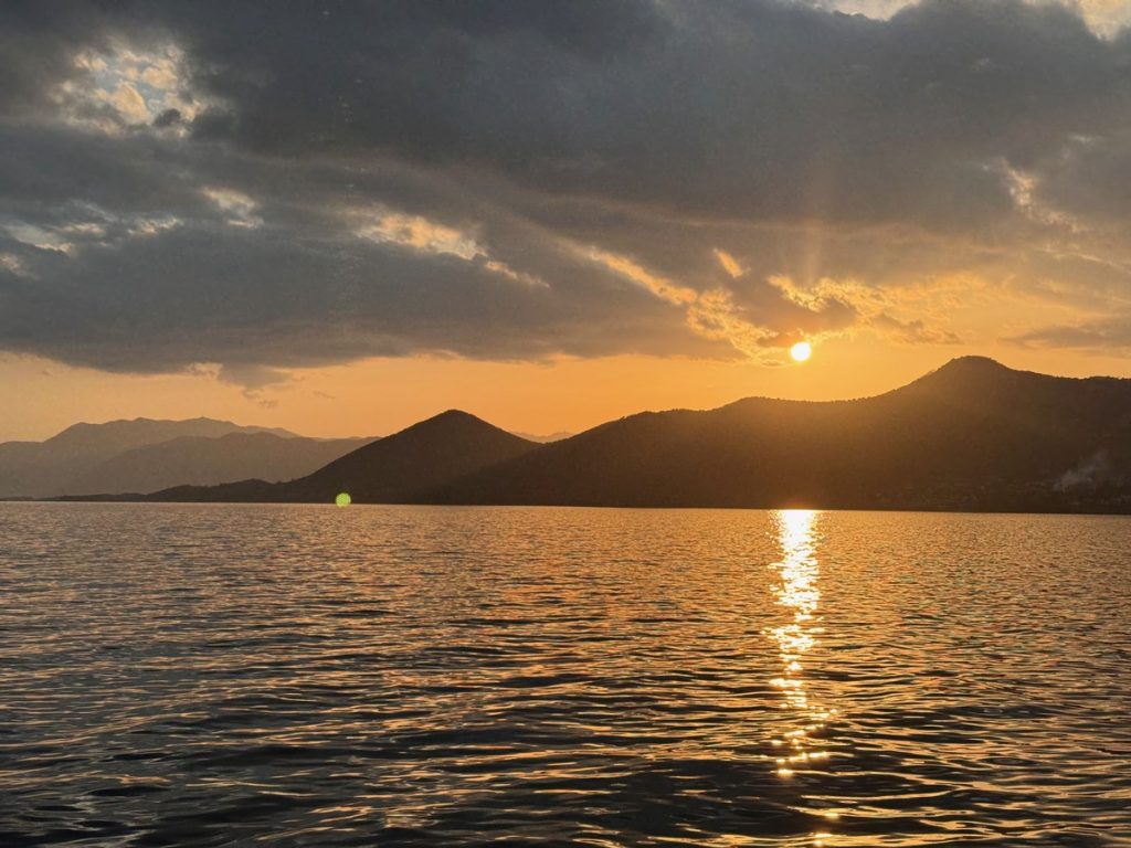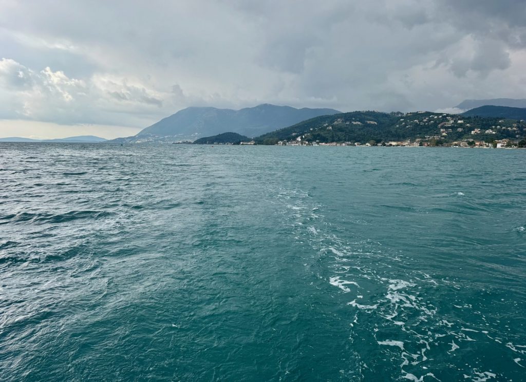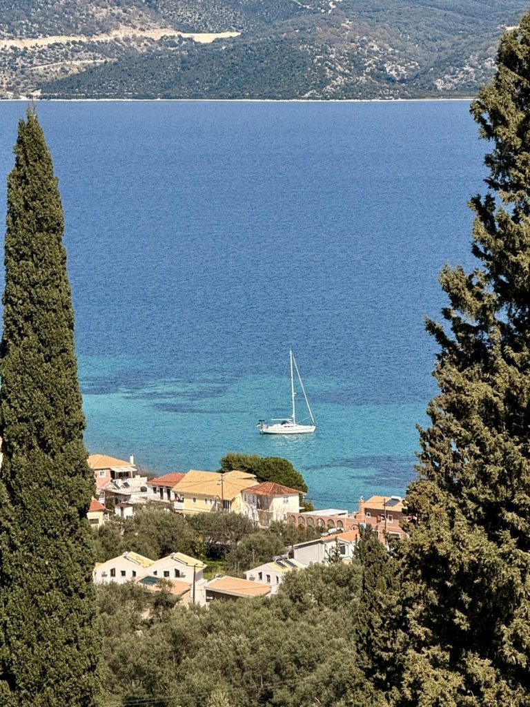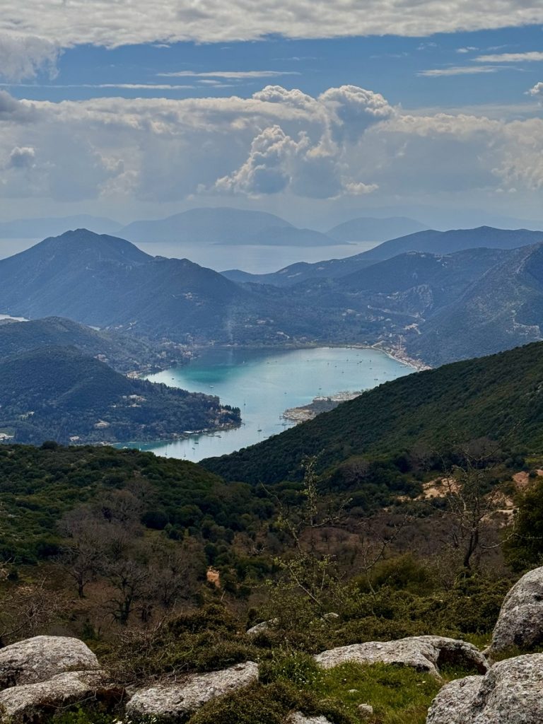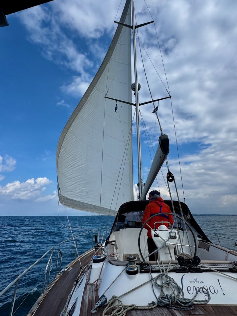 Heute zieht es uns weiter. Anfangs peilen wir Mytikas, einen kleinen Ort etwas südlich an der Festlandsküste an. Aber die Komoot-Recherche lässt dort wenig abwechslungsreiche Wandermöglichkeit erkennen. Auch dort gibt es eine große Tiefebene und bis zu den ersten Anstiegen sind erstmal einige Kilometer zurück zu legen. Also biegen wir im 90° Winkel ab und laufen (unter Maschine, da absolut gebügeltes Wasser) nach Westen in Richtung Lefkada. Etwas nördlich von Nydri gibt es den Berg Skaros, den die Skipperin schon seit letztem März im Auge hat. Dort will sie unbedingt mal rauf. Nach ein paar Meilen kommt plötzlich Südwind auf. Nicht viel, aber segelbar. Also wird die Genua ausgerollt und die letzten 6 Seemeilen ganz entspannt auf Halbwindkurs mit 4 Knoten gesegelt. Bei der Gelegenheit wird nun natürlich auch der Autopilot getestet. Alles funktioniert bestens – unser 3. Crewmitglied ist wieder an Bord!