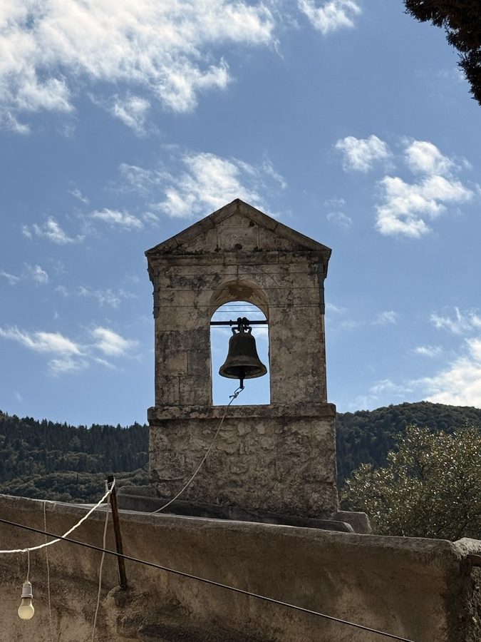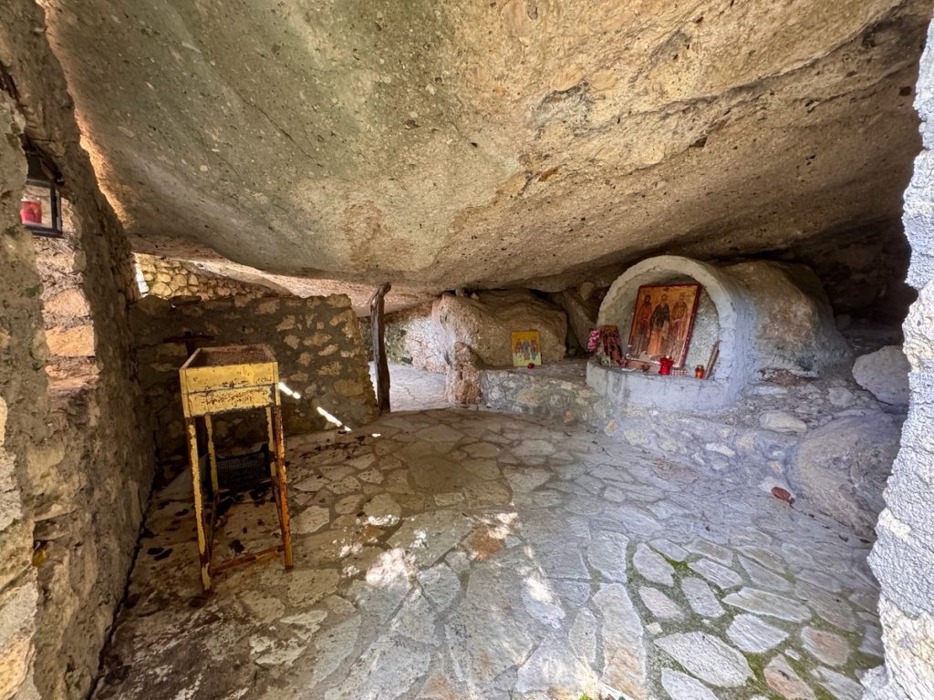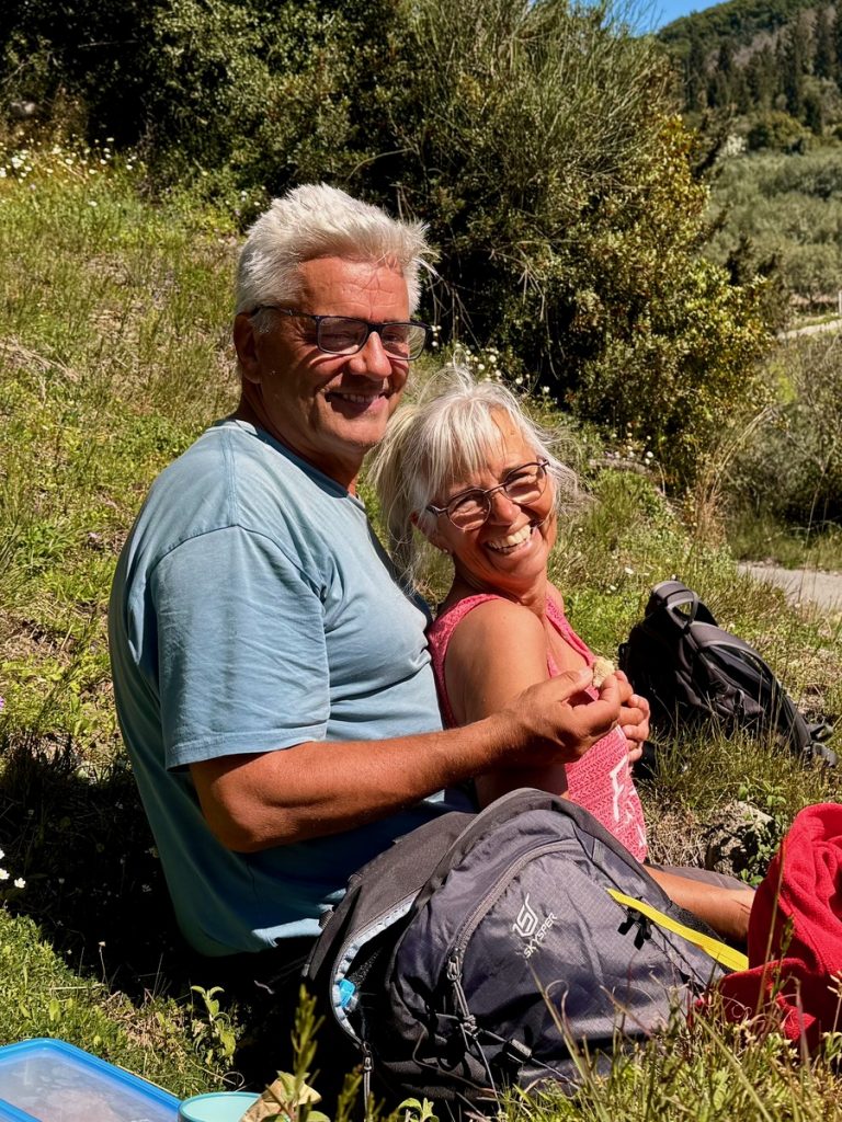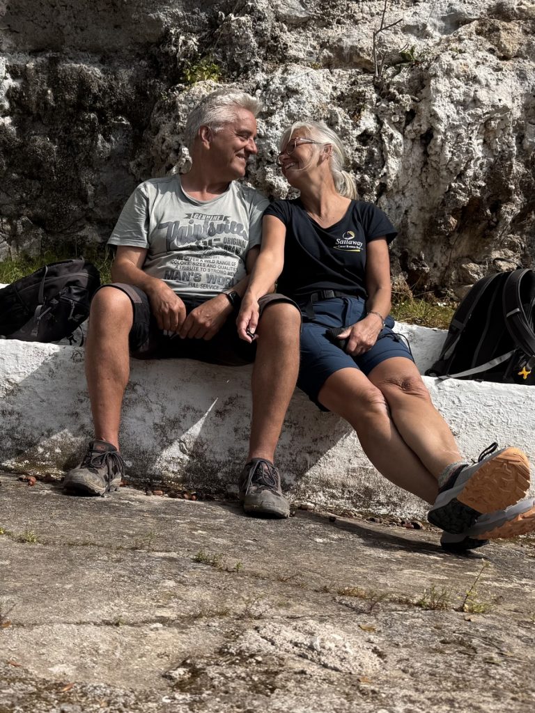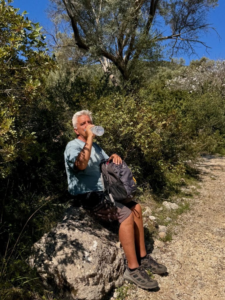 Vor dem kleinen Örtchen Nikiana fällt der Anker in türkisfarbenem Wasser – leider noch immer zu kalt zum Baden – zumindest für uns: 16,6°C. Die Sonne scheint von einem blauen Himmel und wir lassen uns erstmal das Sonntagsfrühstück im Cockpit schmecken. Danach ist es Zeit für eine kleinere Wanderrunde von gut 9 Kilometern mit 330 Höhenmetern. Unterwegs kommen wir an einer urigen Einsiedelei vorbei und gönnen uns eine kleine Rast. Leider sehen wir aber auch bei dieser Runde wieder einige wilde Müllkippen – so schade!