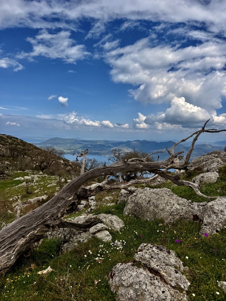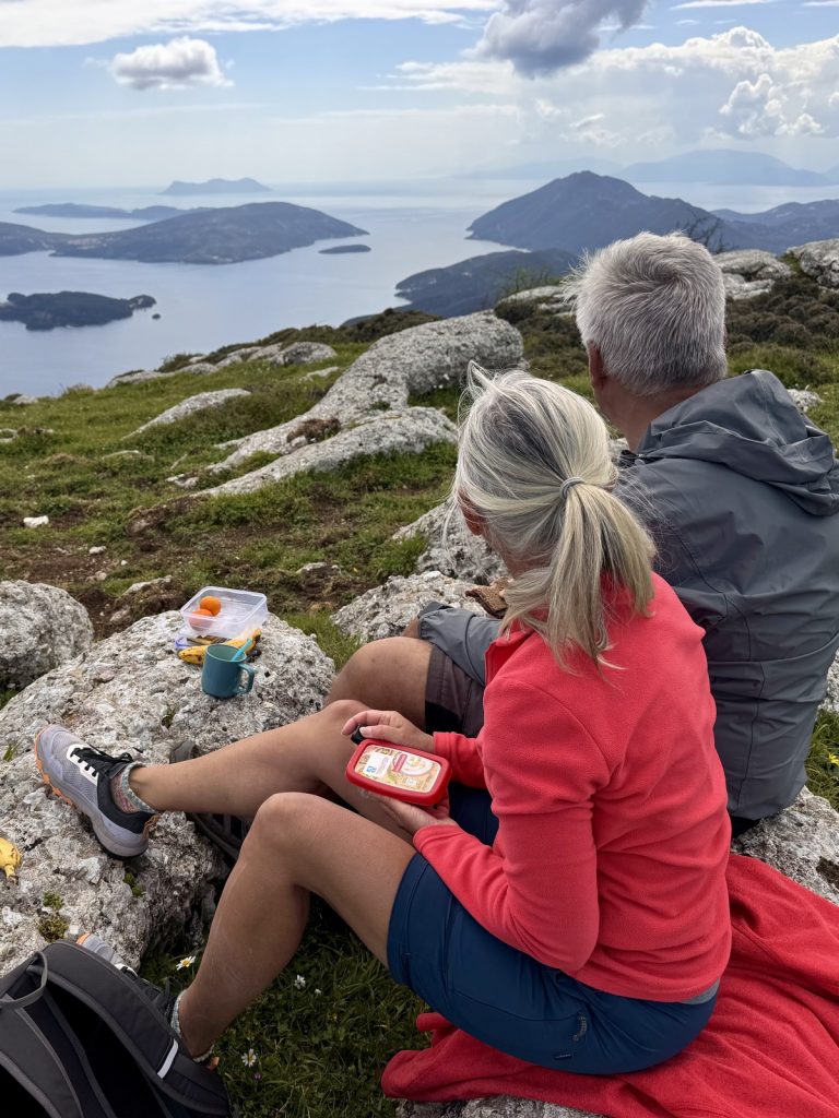 Vom Gipfel des Skaros haben wir dann einen atemberaubenden Blick, der im Norden bis zum Eingang in den Ambrakischen Golf bei Preveza und im Süden bis nach Ithaka und Kefalonia reicht. Zum Glück ist es windstill, denn trotz Fleecepulli ist es ziemlich kalt. Das Picknick mit Ausblick lassen wir uns aber nicht nehmen!