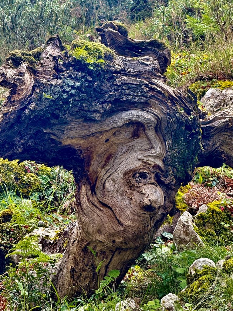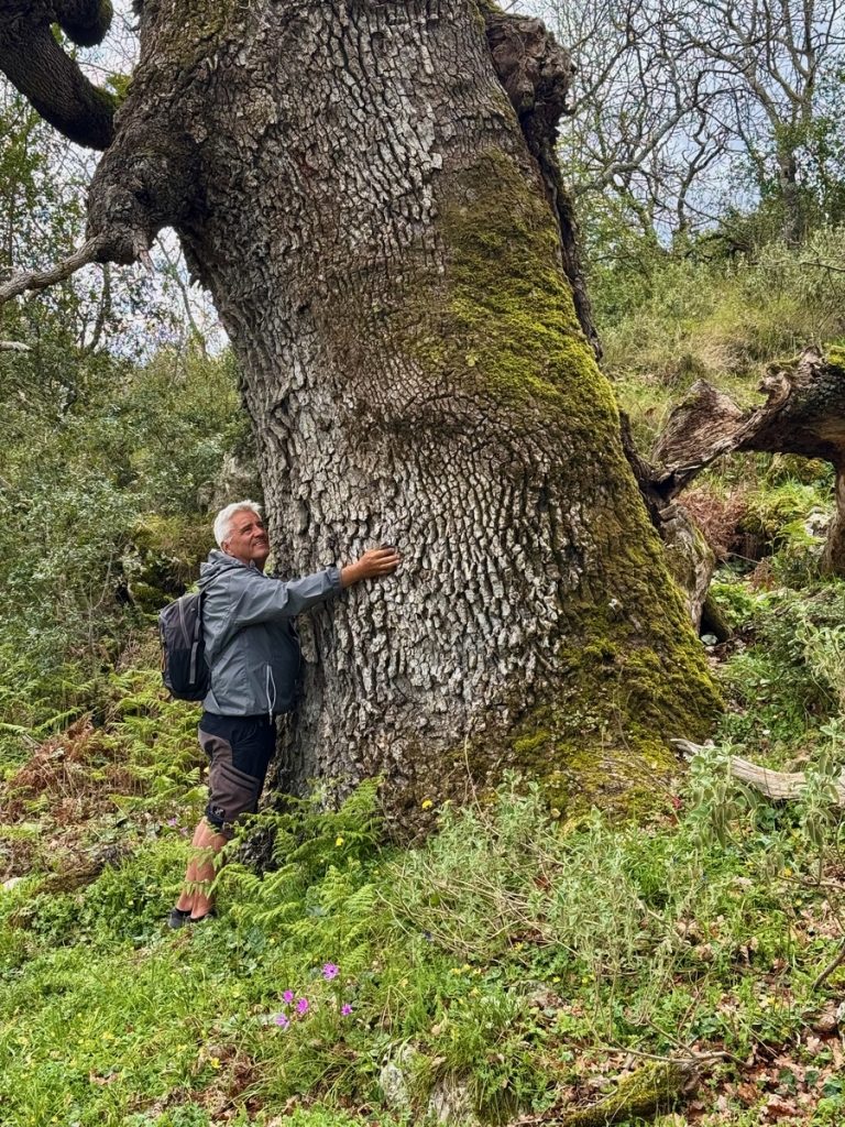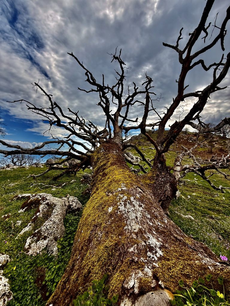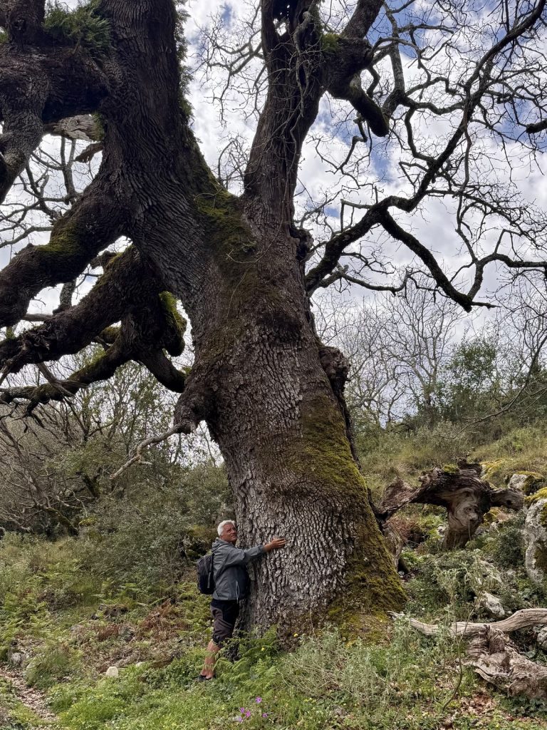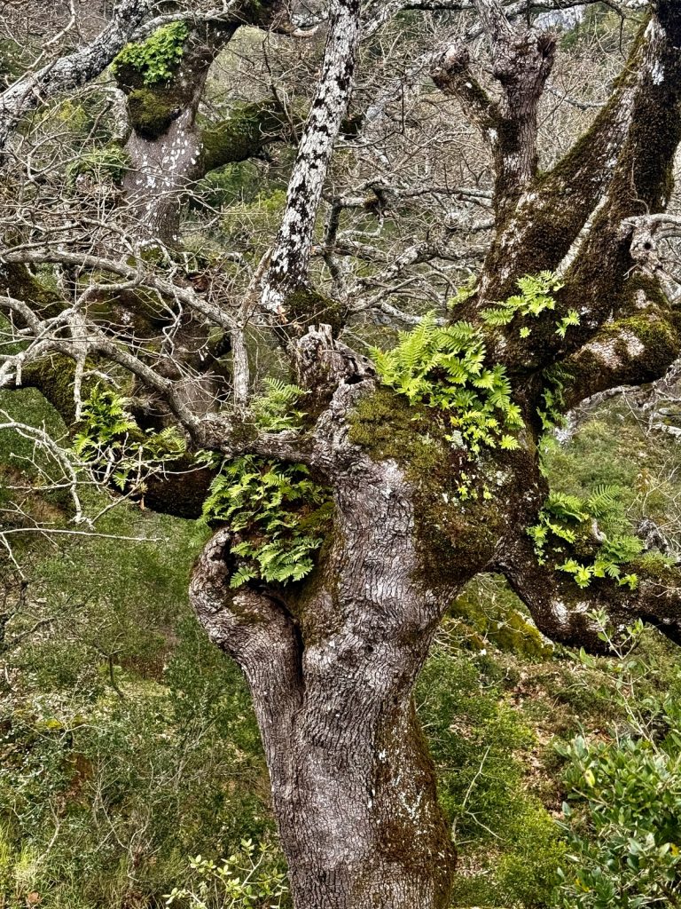 Nun wird aus dem Weg ein Pfad und wir wandern im Gänsemarsch. Die Steigung bringt uns schnell dazu, die Fleecepullis auszuziehen. Der Kreislauf hat zu tun und wir schrauben uns Meter für Meter in die Höhe. Wir laufen in dichtem Grün, aber immer mal wieder öffnet sich die grüne Wand für einen Blick über den Ort, Venga! und das Meer. Unverhofft beginnt es zu tröpfeln. Wir sind verwirrt. Das hatte unsere Wetterapp nicht vorhergesagt und auf dem Niederschlagsradar ist auch keine Regenwolke zu finden. Die Skipperin hat sich auf Trockenheit eingestellt – Regenjacke Fehlanzeige, der Skipper ist dagegen gut vorbereitet und bietet seine Jacke der Skipperin an – Gentlemen like 😉 . Aber wir stellen uns unter dichtem Blattwerk unter und warten erstmal ab. Nach wenigen Tropfen hört es wieder auf – weiter geht’s. Das dichte Gebüsch weicht mehr und mehr einem lichteren Bewuchs um schließlich nur noch aus Gras und Blumen zu bestehen. Der Weg windet sich nun in Serpentinen die letzten Meter bis auf einen Sattel. Und als wir ihn überschreiten, liegt auf der anderen Seite eine ganz andere Vegetation vor uns. Uralte, zurzeit noch kahle Eichen stehen vor uns. Auf ihnen wachsen Moose, Farne und Flechten – ein mystischer Märchenwald. Und unverhofft setzt der Regen wieder ein, stärker leider – es ist kalt. Der Skipper packt seine Regenjacke (!) aus, die Skipperin versucht sich mit einem Handtuch zu schützen und so warten wir den Schauer, der dann auch noch Hagel im Gepäck hat, unter einem dicken, abgeknickten Eichenstamm ab, bevor wir den Weg bis zum Gipfel fortsetzen können.