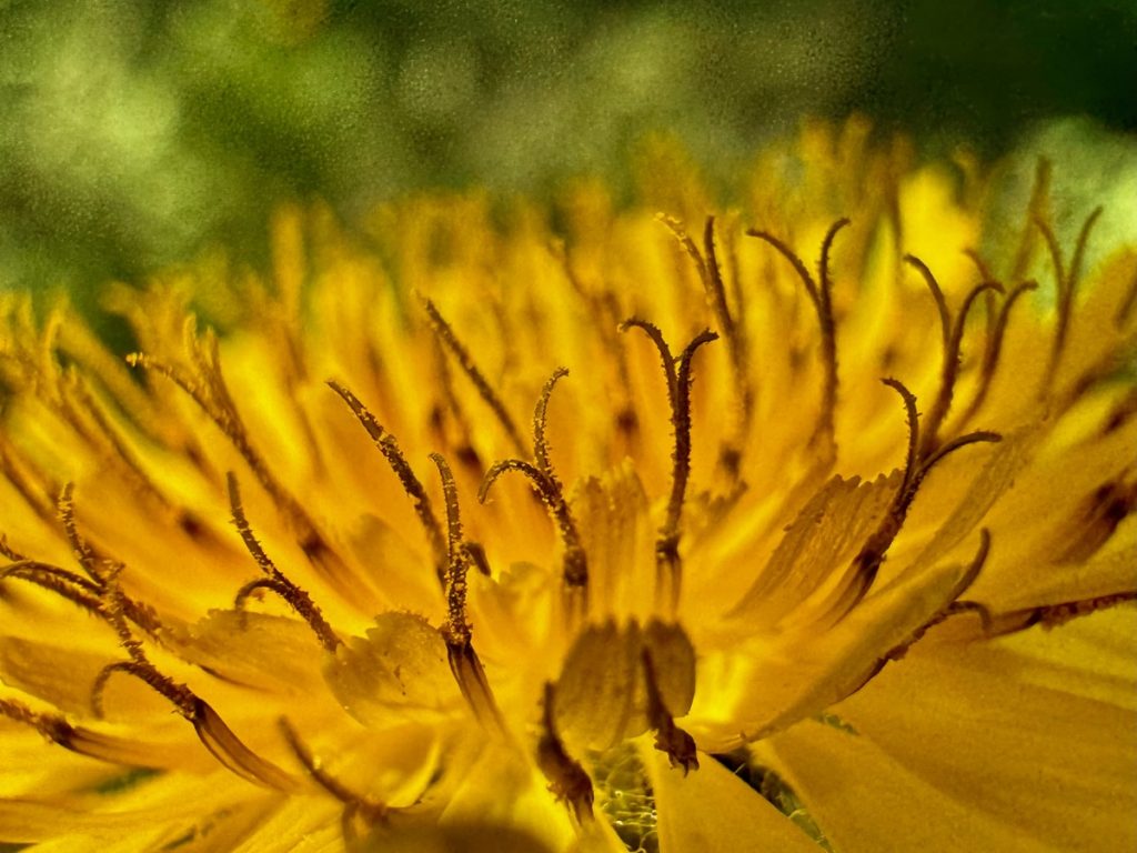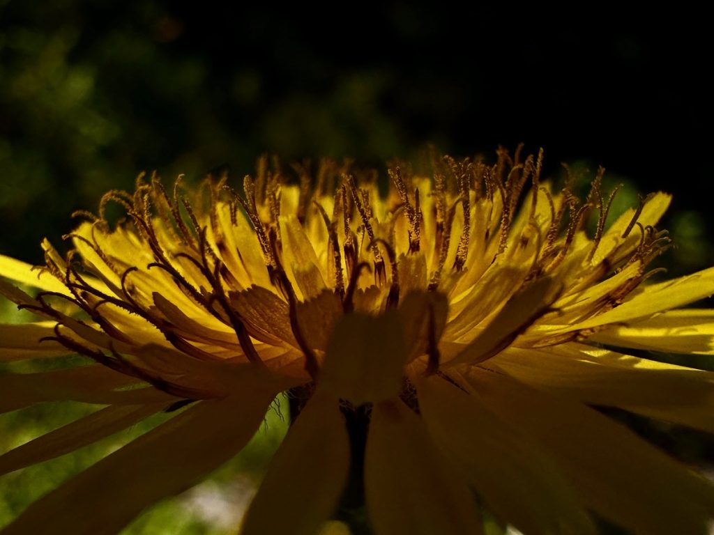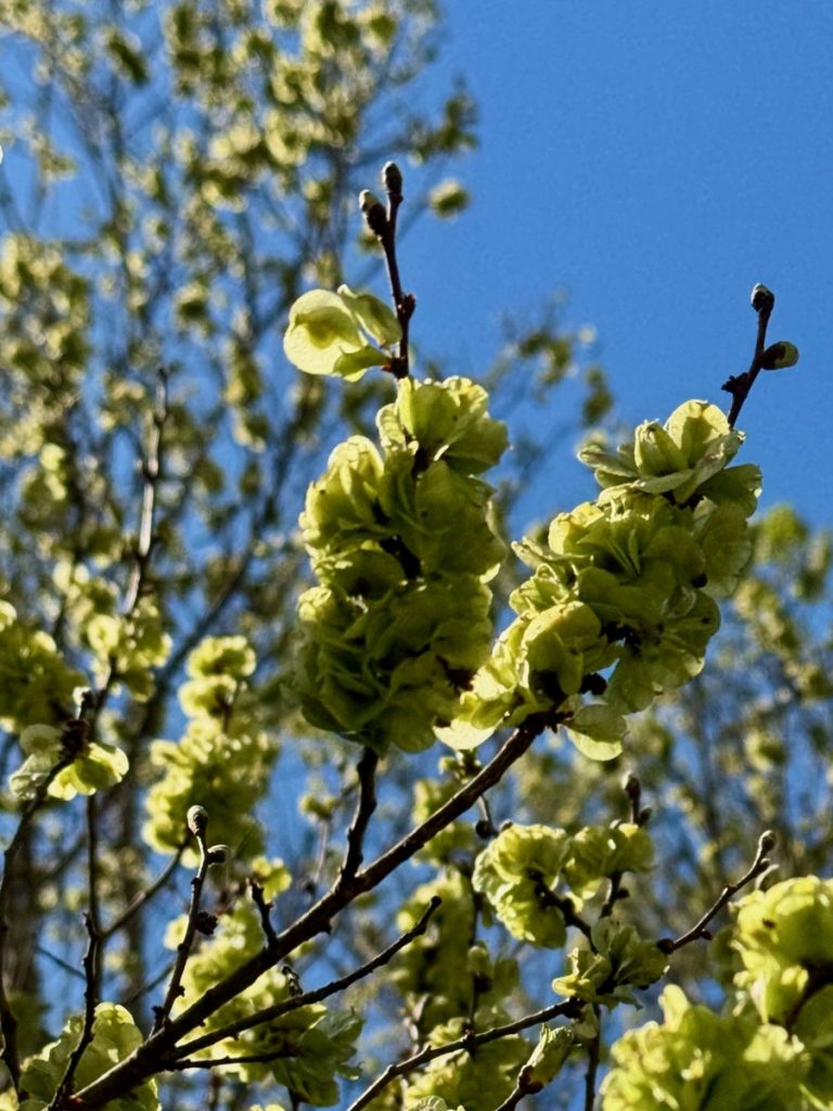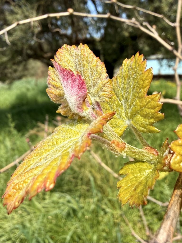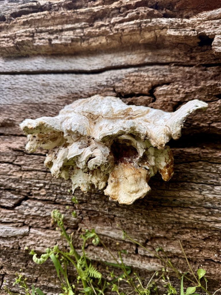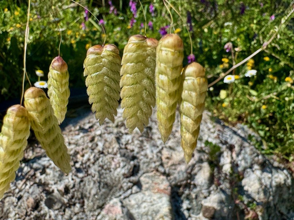 Nun wird aus dem Weg ein Pfad und wir wandern im Gänsemarsch. Die Steigung bringt uns schnell dazu, die Fleecepullis auszuziehen. Der Kreislauf hat zu tun und wir schrauben uns Meter für Meter in die Höhe. Wir laufen in dichtem Grün, aber immer mal wieder öffnet sich die grüne Wand für einen Blick über den Ort, Venga! und das Meer. Unverhofft beginnt es zu tröpfeln. Wir sind verwirrt. Das hatte unsere Wetterapp nicht vorhergesagt und auf dem Niederschlagsradar ist auch keine Regenwolke zu finden. Die Skipperin hat sich auf Trockenheit eingestellt – Regenjacke Fehlanzeige, der Skipper ist dagegen gut vorbereitet und bietet seine Jacke der Skipperin an – Gentlemen like 😉 . Aber wir stellen uns unter dichtem Blattwerk unter und warten erstmal ab. Nach wenigen Tropfen hört es wieder auf – weiter geht’s. Das dichte Gebüsch weicht mehr und mehr einem lichteren Bewuchs um schließlich nur noch aus Gras und Blumen zu bestehen. Der Weg windet sich nun in Serpentinen die letzten Meter bis auf einen Sattel. Und als wir ihn überschreiten, liegt auf der anderen Seite eine ganz andere Vegetation vor uns. Uralte, zurzeit noch kahle Eichen stehen vor uns. Auf ihnen wachsen Moose, Farne und Flechten – ein mystischer Märchenwald. Und unverhofft setzt der Regen wieder ein, stärker leider – es ist kalt. Der Skipper packt seine Regenjacke (!) aus, die Skipperin versucht sich mit einem Handtuch zu schützen und so warten wir den Schauer, der dann auch noch Hagel im Gepäck hat, unter einem dicken, abgeknickten Eichenstamm ab, bevor wir den Weg bis zum Gipfel fortsetzen können.