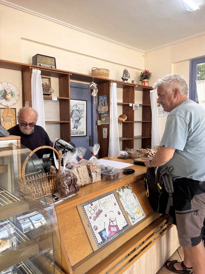 Den größten Teil des Rückweges über geteerte Nebenstraßen kennen wir nun schon von unserer gestrigen Wanderung. Hier müssen wir nicht mehr auf jeden Schritt achten und können den Blick schweifen lassen, während die Beine fast automatisch ihre Arbeit tun. Nach 16 Kilometern und insgesamt 720 Höhenmetern erreichen wir Nikiana, kaufen noch ein paar Kleinigkeiten für das Abendessen und setzen dann zur Venga! über. Wir sind kaputt und freuen uns, dass die Sonne ins Cockpit scheint und wir uns unter einer Wolldecke langmachen können. Abends zaubert Werner eine Kartoffelpfanne und dazu gibt’s griechische Bratwurst. Das Bett ruft heute Abend laut – morgen machen wir Wanderpause!