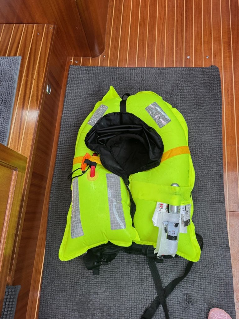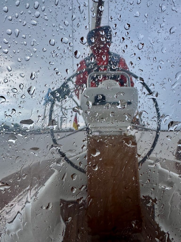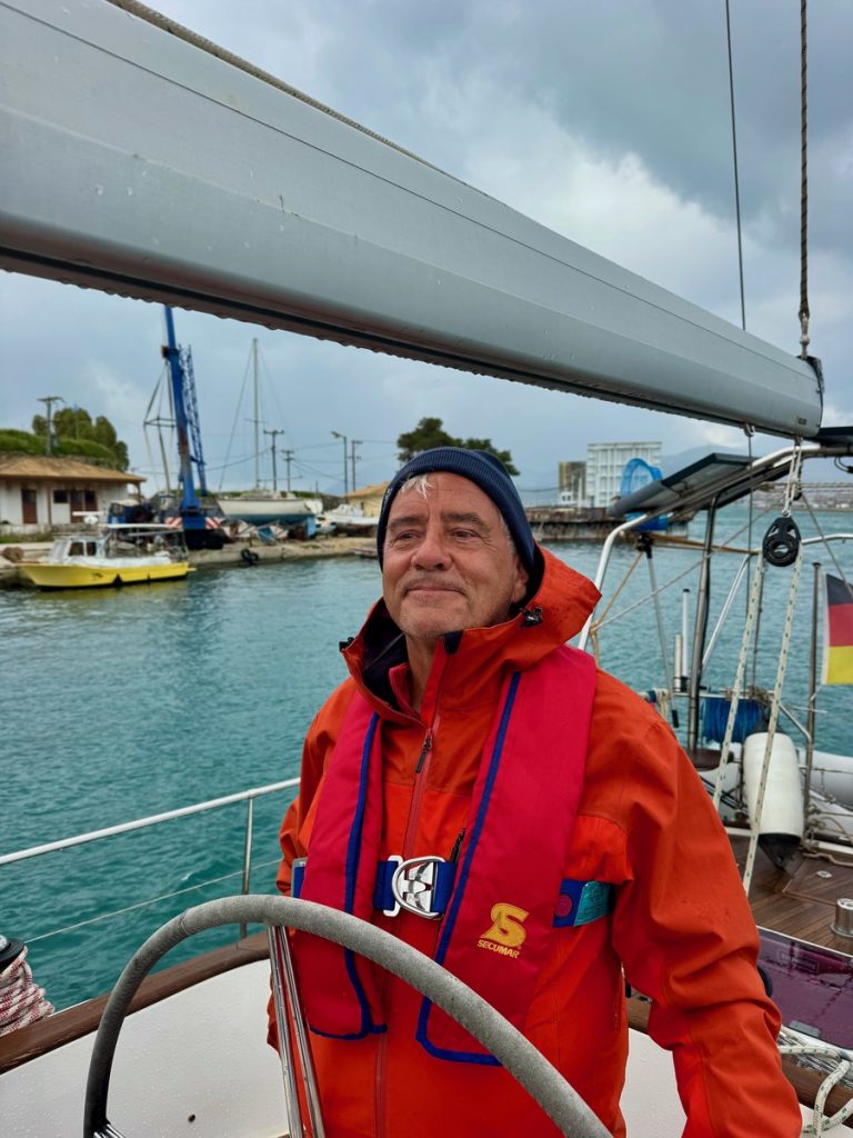 Der Morgen begrüßt uns mit wenig Sonne und das Niederschlagsradar von WetterOnline zeigt eine Regenwolke über der Insel. Wir klaren auf und machen Venga! seefest, denn vom vergangenen November wissen wir, wie unangenehm die Welle auf dem Stück vom Lefkada-Kanal bis zum Eingang in den Ambrakischen Golf sein kann. Das Dinghi wird gut am Heck vertäut und dann holen wir den Anker rauf – er zickt etwas rum – saß mal wieder bombenfest. Wir ankern auf Höhe der ersten Fahrwassermarkieren des Kanals, also laufen wir gleich unter Maschine. Bis zur Brücke sind es 3,5 Seemeilen und wir haben noch gut eine Stunde Zeit. Der erste Regen setzt ein und der Skipper übernimmt die Cockpitschicht. Wahrscheinlich bleibt er mit dem manuellen Auslösemechanismus der Schwimmweste versehentlich irgendwo hängen – im Nu löst sie aus und er hat eine knallgelbe Krawatte.