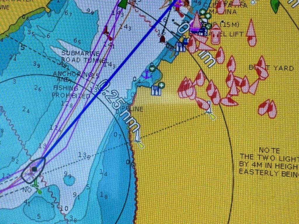 Gleich nach der Ausfahrt aus dem kleinen Schutzhafen hinter der Brücke, rollen wir die Genua aus. Der Wind kommt fast platt von hinten, der Mittelmeerschwell (ca. 1,5m) rollt aus Westen quer auf uns zu. Das führt zu ordentlichem Geschaukel. Nach 5 Seemeilen biegen wir ins Fahrwasser zum Ambrakischen Golf ab und müssen über die Plotteranzeige lachen. Dort sehen wir alle anderen Boote mit AIS. Sie werden meist in grün angezeigt, erst wenn wir uns ihnen nähern wechseln sie ihre Farbe zu rot, um uns auf eine mögliche Kollision hinzuweisen. Hier sehen wir nun zahllose rote Boote – allerdings besteht keine Gefahr der Kollision, denn sie liegen alle an Land in den Boatyards.