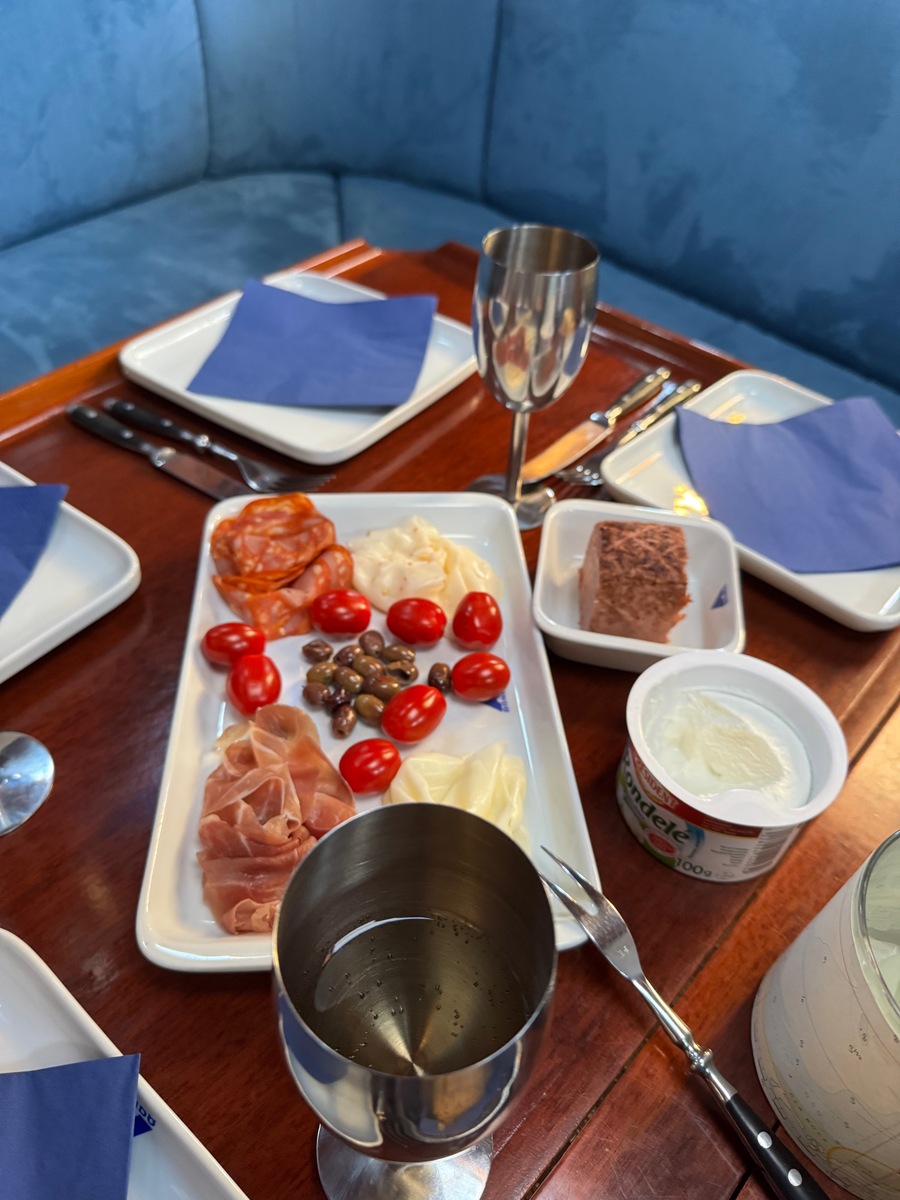 Den Abend verbringen wir im Cockpit der Möve-Crew zusammen mit der Crew der Malin, die erstmals den Weg zum Vindötreffen gefunden haben. Sie schießen in diesem Jahr den Vogel bezüglich der weitesten Anreise ab, denn sie kommen von der schwäbischen Alb. Wir werden kulinarisch-international verwöhnt mit Pfannkuchen mit argentinischer „Dulce de Leche“, einem amerikanischen Cocktail „White Lady“ und leckerem italienischen Pastagericht.