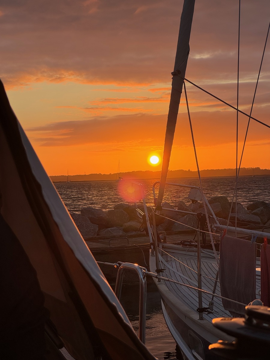 Schon früh am Morgen kehrt Leben im Hafen ein. Viele Boote starten den Rückweg in Richtung Flensburger Förde oder die Weiterfahrt um die Insel herum, um am morgigen Sonntag nach Kiel, Eckernförde oder in die Schlei zu laufen. Uns wird bewusst, wie glücklich wir uns schätzen können, diesen Zeitdruck nicht mehr zu haben und uns hier in der dänischen Südsee noch ein wenig treiben lassen zu können. Auch wir laufen aus. Der Wind weht schwach aus Nordwest und so setzen wir den rot-weißen Blister und lassen uns gemächlich in Richtung Osten schieben. Durch Zufall haben wir vorgestern erfahren, dass Freunde aus Brandenburg gerade als Kojengäste auf einem Traditionssegler unterwegs sind. Heutiges Ziel: Marstal. Da wollen wir nun auch hin, um die beiden nach fast zwei Jahren mal wieder in die Arme schließen zu können. Leider legt sich der Wind bald ganz schlafen und so muss der Motor wieder arbeiten. Aber zumindest die halbe Strecke konnten wir segeln! In Marstal finden wir einen schönen Platz an der vorletzten Brücke. Die Gästestege sind nur zur Hälfte belegt. Das haben wir an einem Himmelfahrtswochenende auch schon ganz anders erlebt! Wir klaren auf und schlendern dann entlang des Museums- und Fischerhafens bis zur Einfahrt. Dort sehen wir dann schon den holländischen Traditionssegler mit unseren Freunden Thomas & Heike an Bord einlaufen – große Freude, Walnussbier und ein entspannt-schöner gemeinsamer Abend mit sagenhaftem Sonnenuntergang folgen. Wir genießen die intensiven sozialen Kontakte in dem Wissen, dass es diesbezüglich bald wieder ruhiger werden wird!